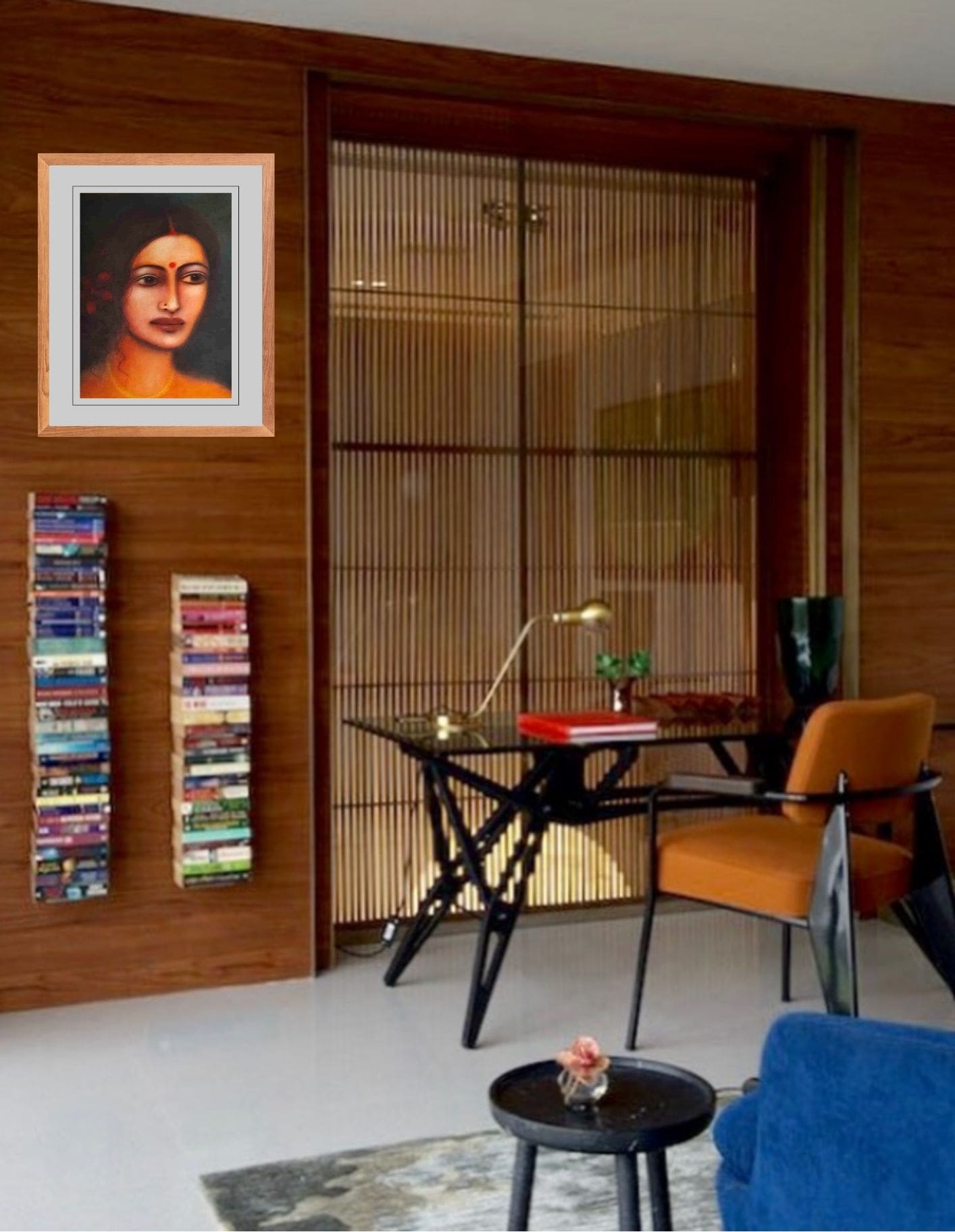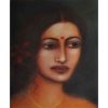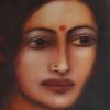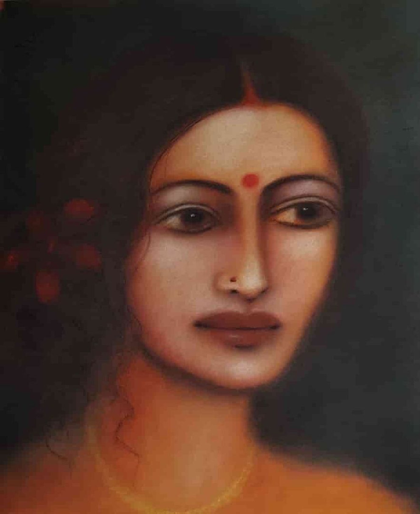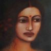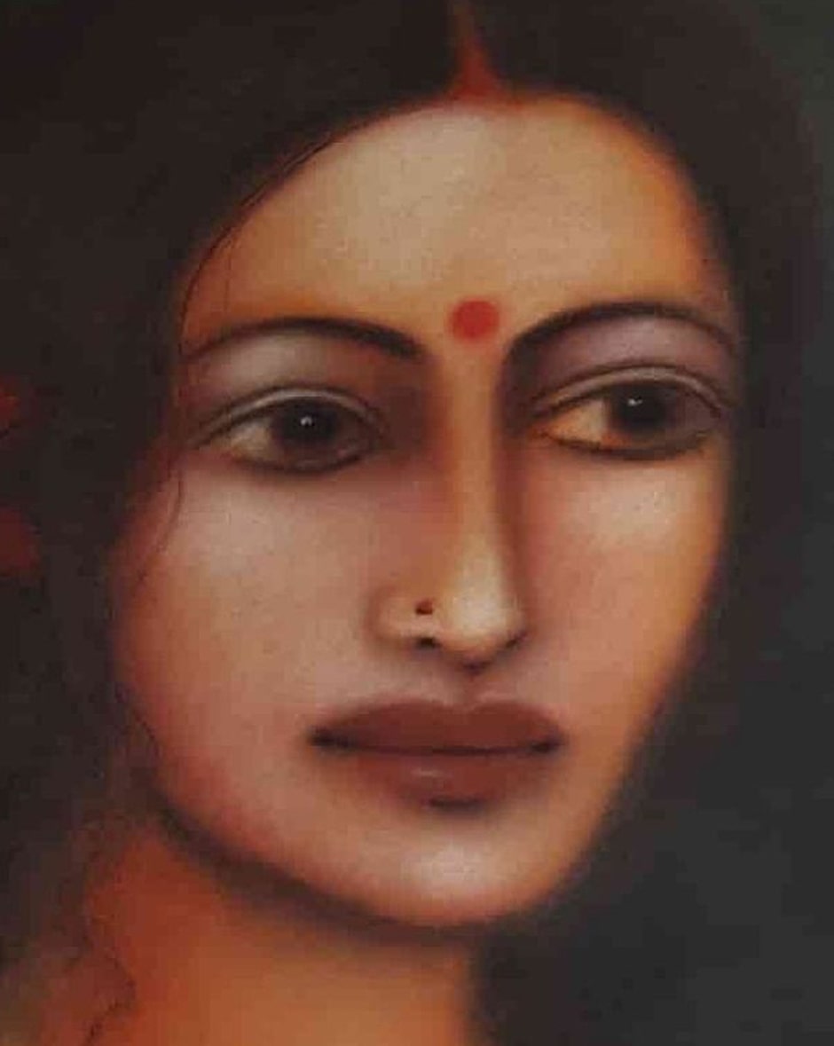 This painting by Suhas Roy captures the ethereal beauty and quiet grace of Radha, a central figure in Indian devotional art. Rendered in soft, velvety tones, the portrait radiates an almost dreamlike aura, with delicate features, soulful eyes, and a serene expression that evoke deep emotion and devotion. The subtle play of light and shadow enhances the sensuous texture of the skin, while minimal adornments—a small red bindi, a delicate nose pin, and a faint gold chain—underscore her understated elegance. Roy’s mastery lies in blending realism with poetic romanticism, creating an intimate portrayal that feels both timeless and deeply personal.