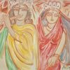 This painting beautifully captures the divine union of Radha and Krishna, rendered in a gentle, expressive modernist style. The artist uses soft, flowing lines and warm earthy tones to evoke a sense of serenity and intimacy. Krishna, dressed in shades of yellow and green, is seen playing his flute — a symbol of divine love and spiritual harmony — while Radha, draped in a graceful red sari, stands beside him in quiet devotion. Their calm, stylized faces convey a timeless connection that transcends words, embodying both love and spiritual unity. The minimal detailing and rhythmic brushstrokes lend the composition an ethereal simplicity, focusing the viewer’s attention on emotion and form rather than ornamentation. This work reflects a harmonious blend of traditional Indian themes with a modern artistic sensibility, celebrating the eternal bond between the human and the divine.