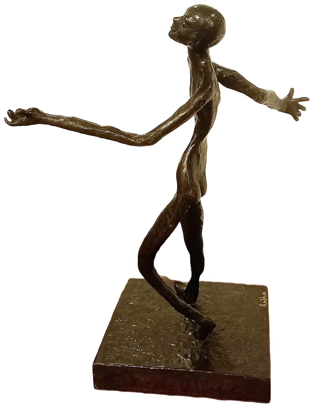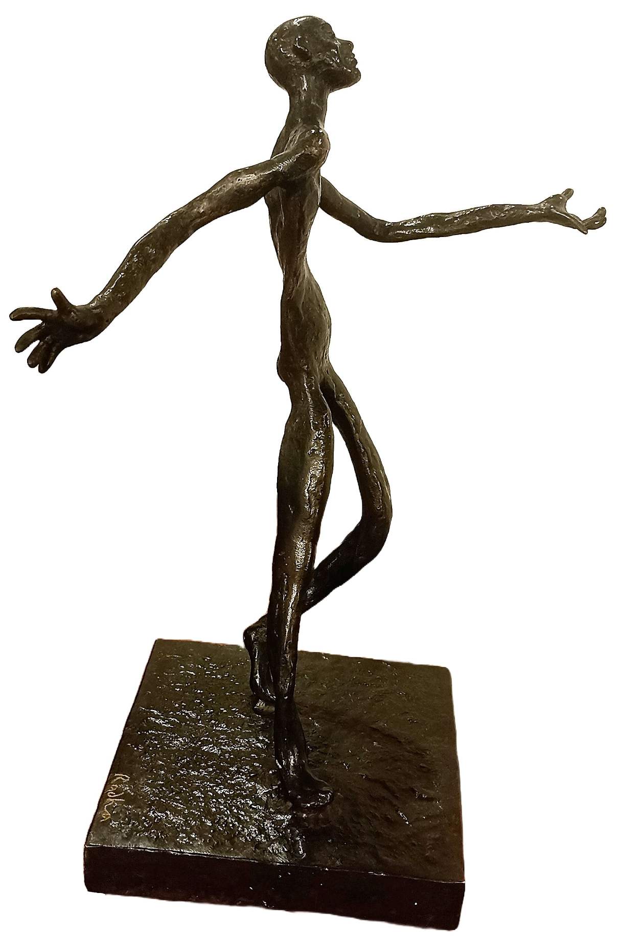 This sculpture presents an elongated figure in a lively, open pose. With textured detailing and graceful movement, the work embodies joy, connection, and the artist’s distinctive sculptural language.