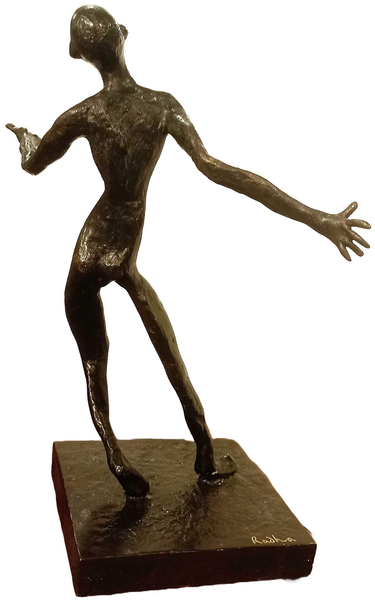 This bronze sculpture by K.S. Radhakrishnan captures a figure in an open, welcoming stance, exuding a sense of joy, movement, and human connection. With elongated limbs, an arched torso, and a tilted head, the form radiates a playful dynamism, as though caught mid-step in a spontaneous dance or gesture. The textured surface adds depth and vitality, allowing light to highlight the contours and expressive posture. True to Radhakrishnan’s signature style, the piece merges abstraction and figuration, focusing on the essence of human expression rather than literal detail.