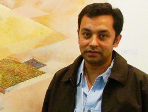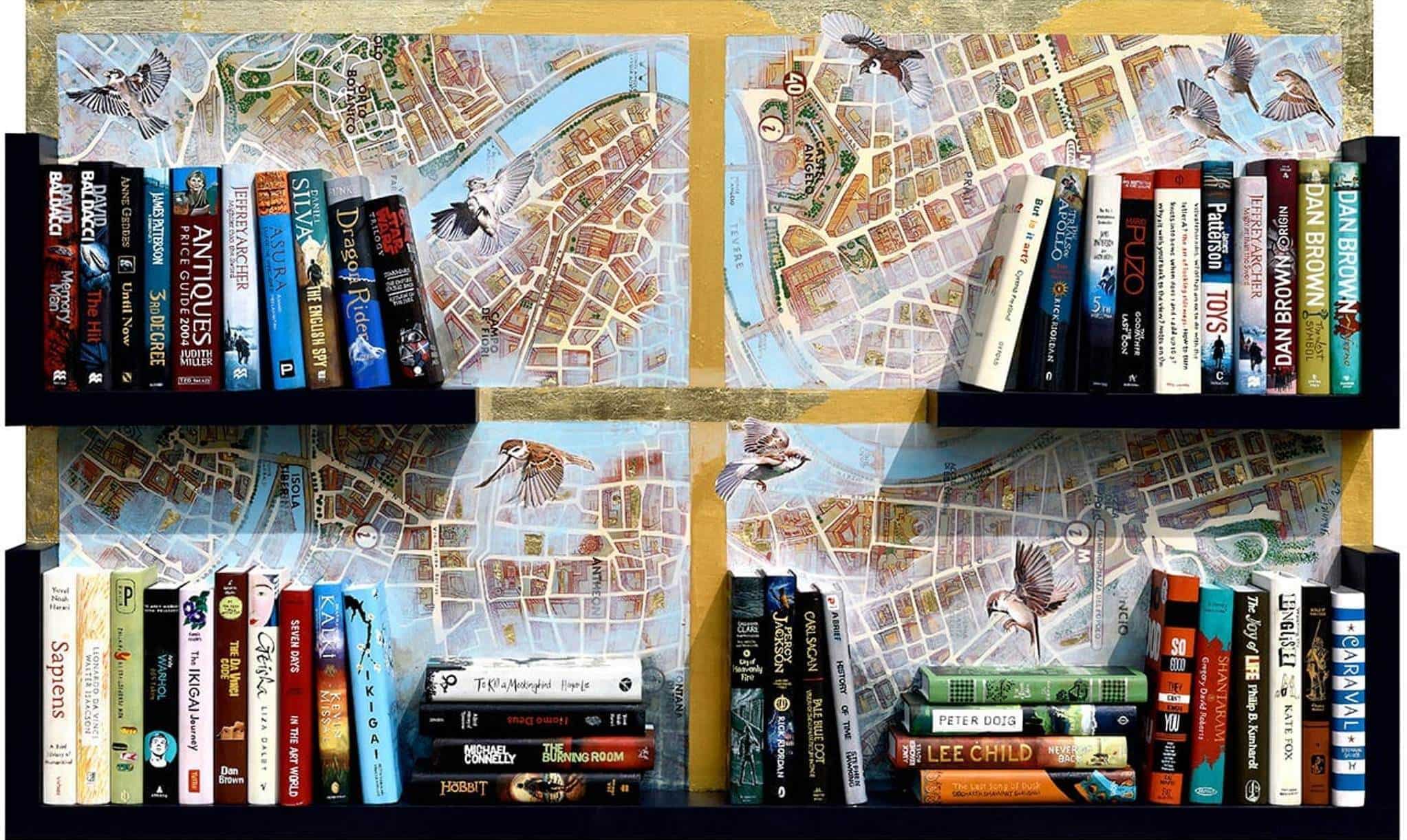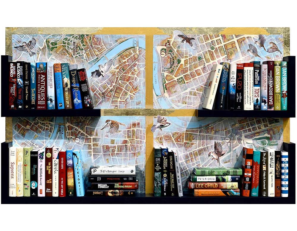 This artwork, titled “Reactivating: The Golden Era” by Arunanshu Chowdhury, is a striking blend of painting and installation that merges literature, urban mapping, and avian symbolism into one cohesive visual experience. Created using acrylic and mixed media on canvas and wood, the piece depicts a set of bookshelves filled with real or painted books, each spine meticulously detailed to evoke the tactile richness of a personal library. Behind the shelves lies a beautifully rendered map-like background, overlaid with delicate birds in flight, symbolizing freedom, knowledge, and exploration. The golden cross-structure running through the background adds a divine or timeless quality—perhaps alluding to enlightenment through art and literature. The juxtaposition of books and maps suggests the journey of the mind and spirit, where stories become pathways and reading transforms into a voyage. Chowdhury’s composition celebrates nostalgia and the enduring power of books in a digital age, reawakening the golden era of intellectual curiosity and creative adventure.