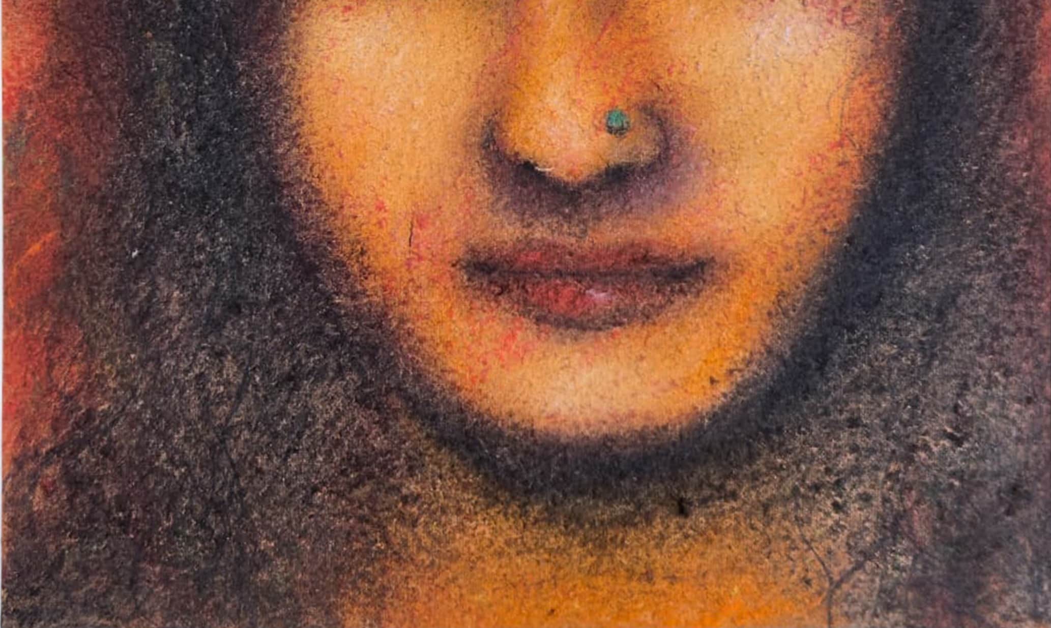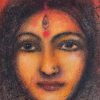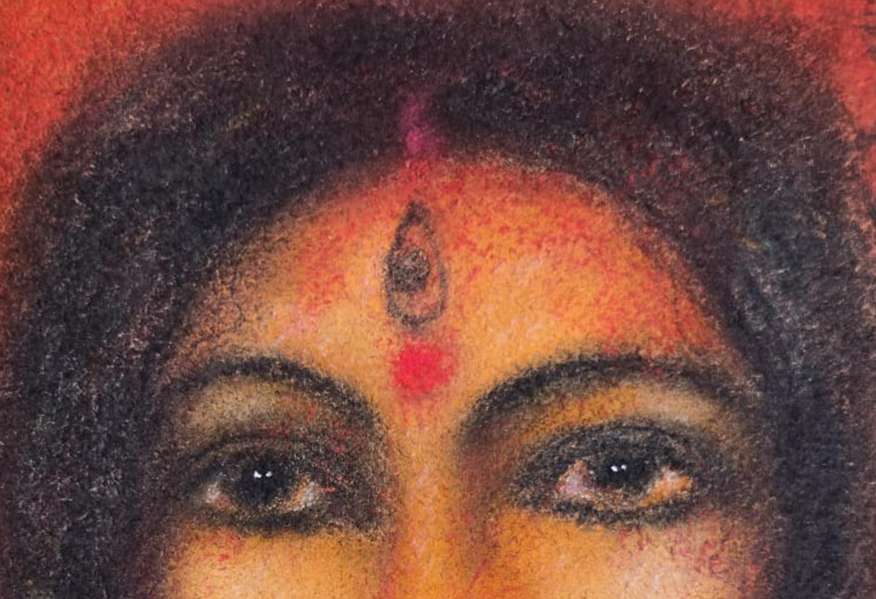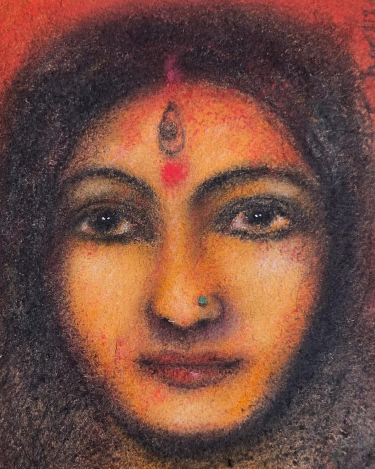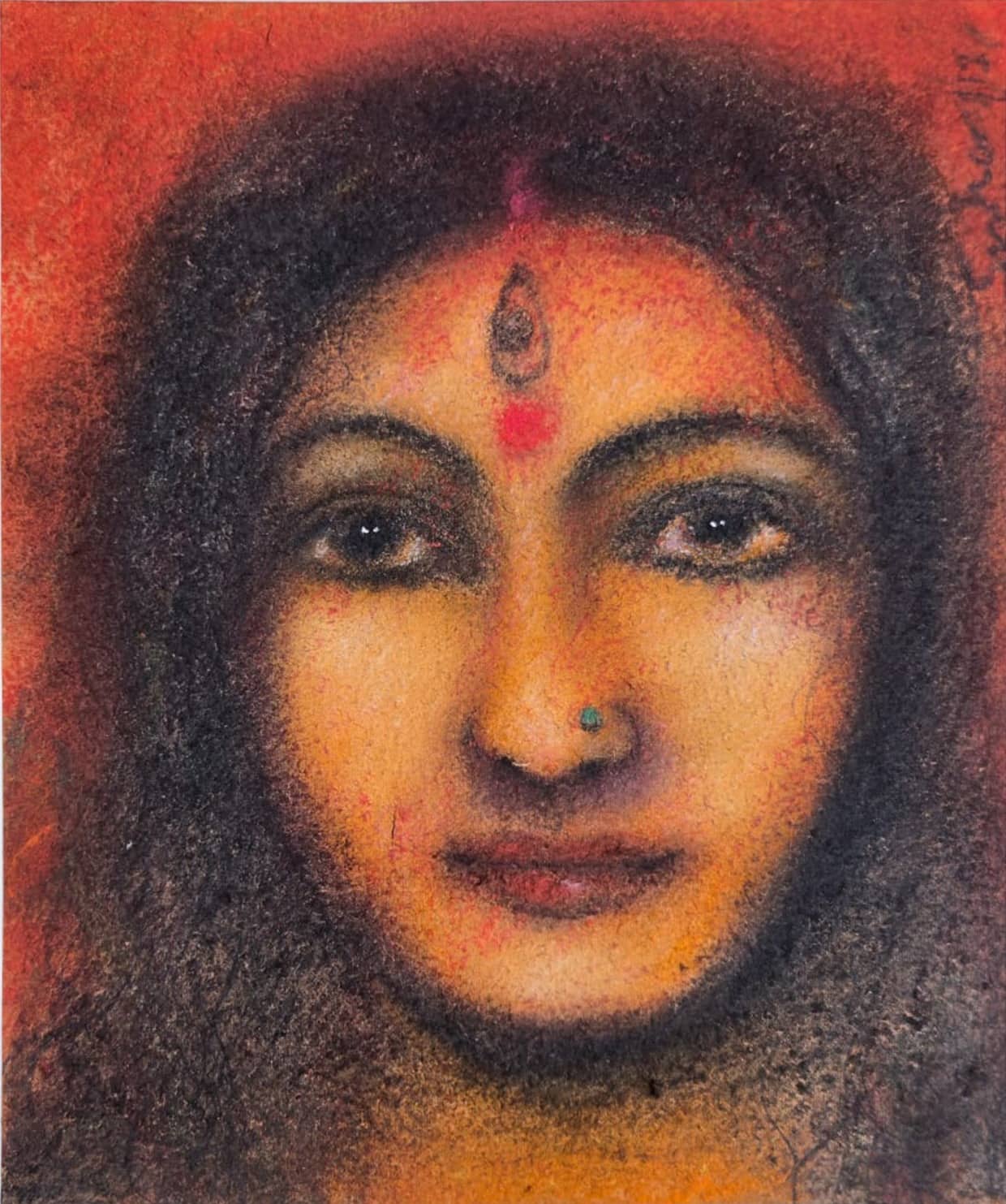 This 2013 pastel on paper by Suhas Roy, titled Shakti, embodies the spiritual strength and quiet grace of the feminine divine. Dominated by warm tones of red and orange, the composition centers on an intense yet serene gaze that draws the viewer inward. The soft blending of pastels creates a velvety texture, giving the face an ethereal glow, while the subtle detailing of the bindi, nose pin, and forehead ornament reinforces her cultural and symbolic presence. Roy’s mastery lies in his ability to evoke both beauty and power in simplicity, making this portrait a timeless invocation of the goddess energy.