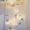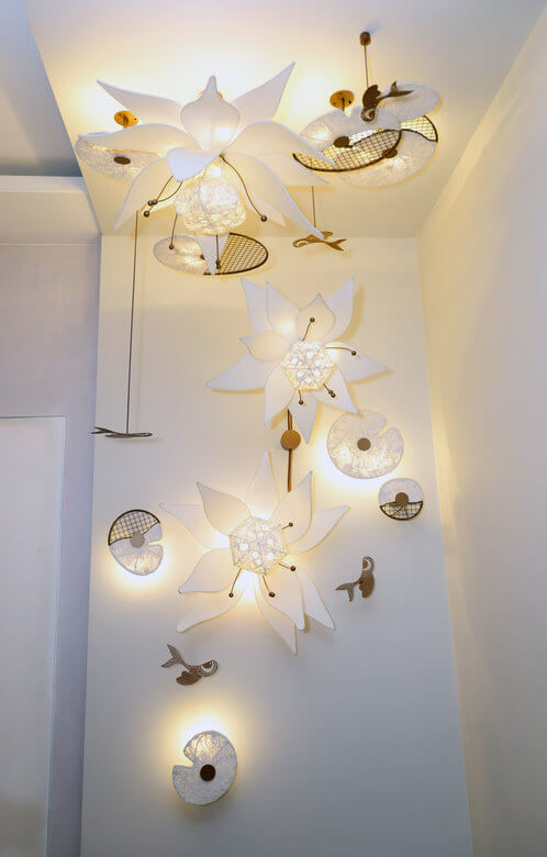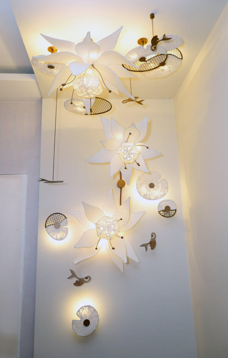 Each lotus form emits a soft, ambient glow, diffusing light through delicately patterned surfaces that enhance the sense of depth and tranquility. The inclusion of organic metal motifs—resembling leaves, lily pads, and small aquatic creatures — adds a dynamic, nature-inspired narrative to the piece. Suspended and wall-mounted elements interact seamlessly, creating a vertical flow that guides the eye upward and enriches spatial perception.
