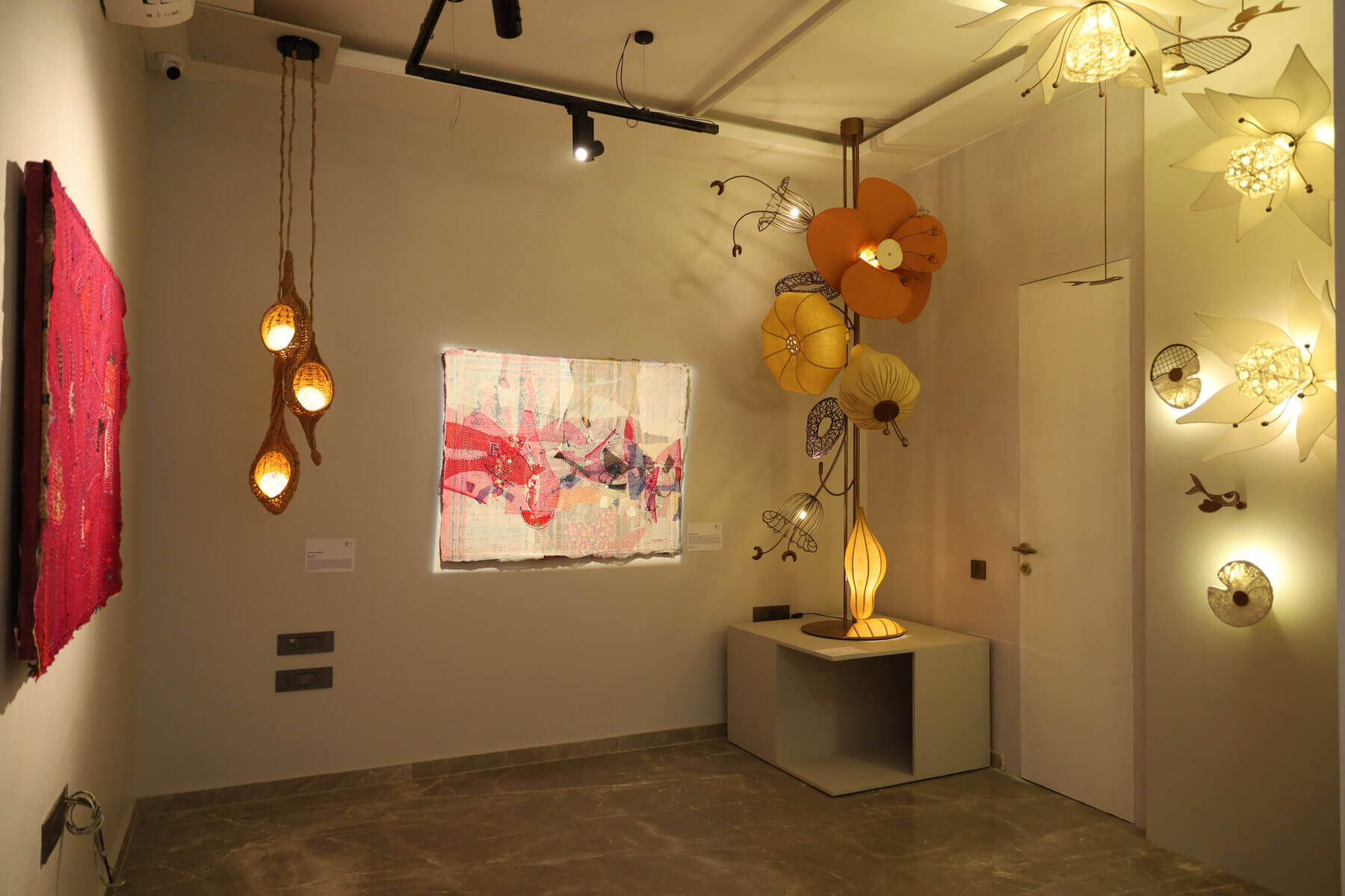 Tamara imagines a luminous lily pond suspended in air, inviting the viewer into its shifting field of forms. Moving from the wall at eye level and flowing across the ceiling, lotus-like blooms unfold around softly illuminated centres while small flying fish introduce a sense of movement and play. Textile stretched over handformed steel armatures is layered with metal mesh and custom paper clay. These surfaces hold and diffuse light, creating a floating landscape that explores fragility, presence, and the shifting relationship between structure and atmosphere.