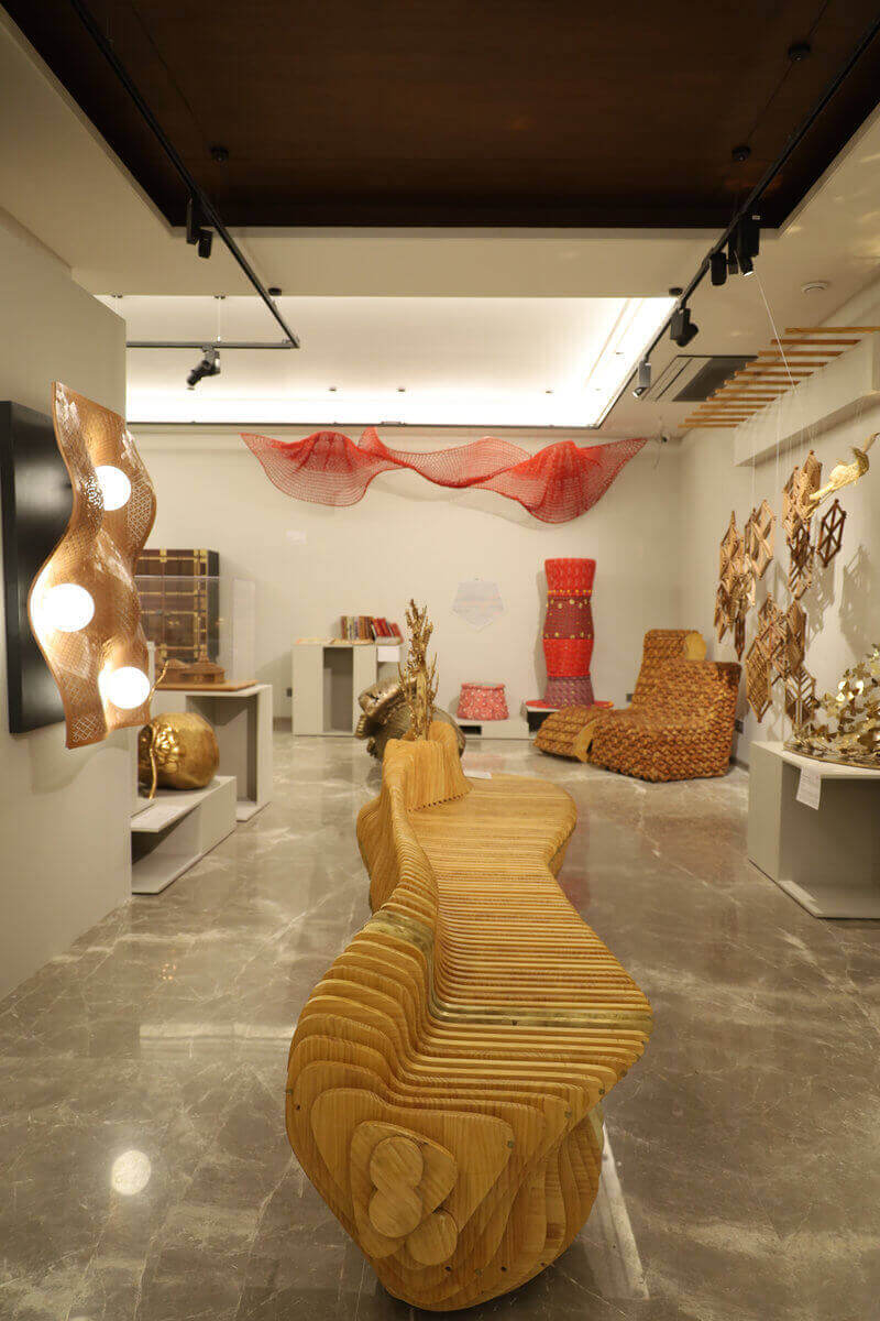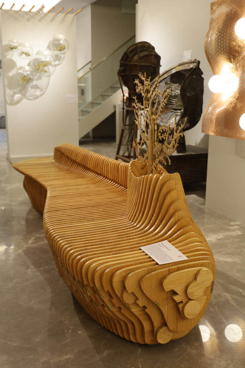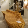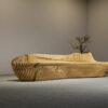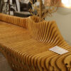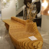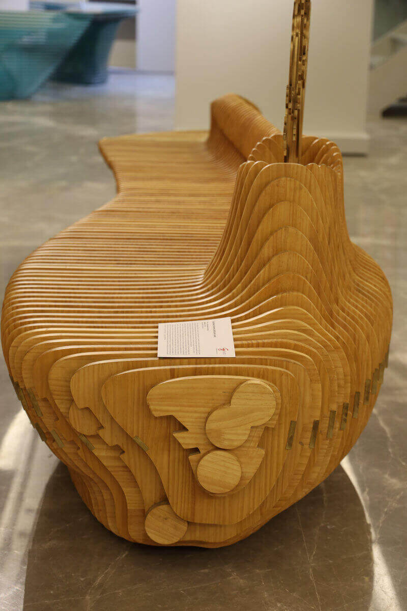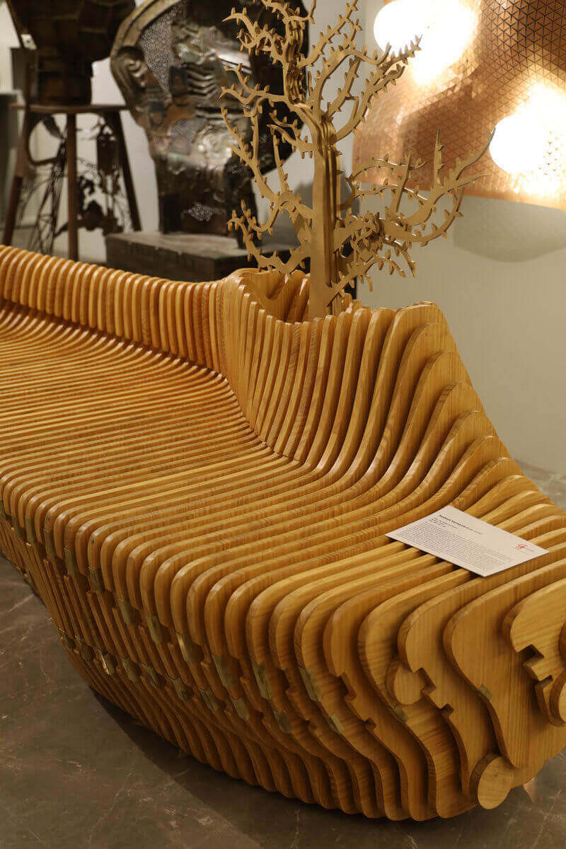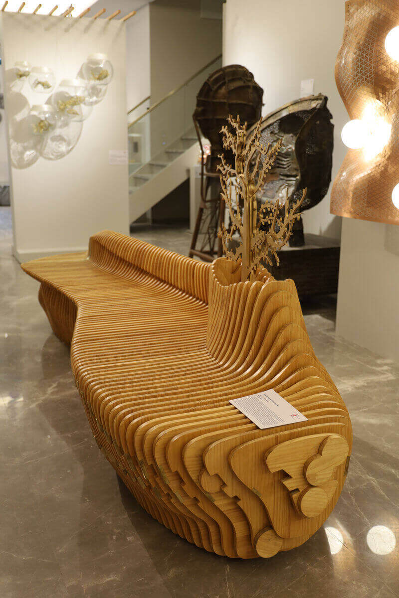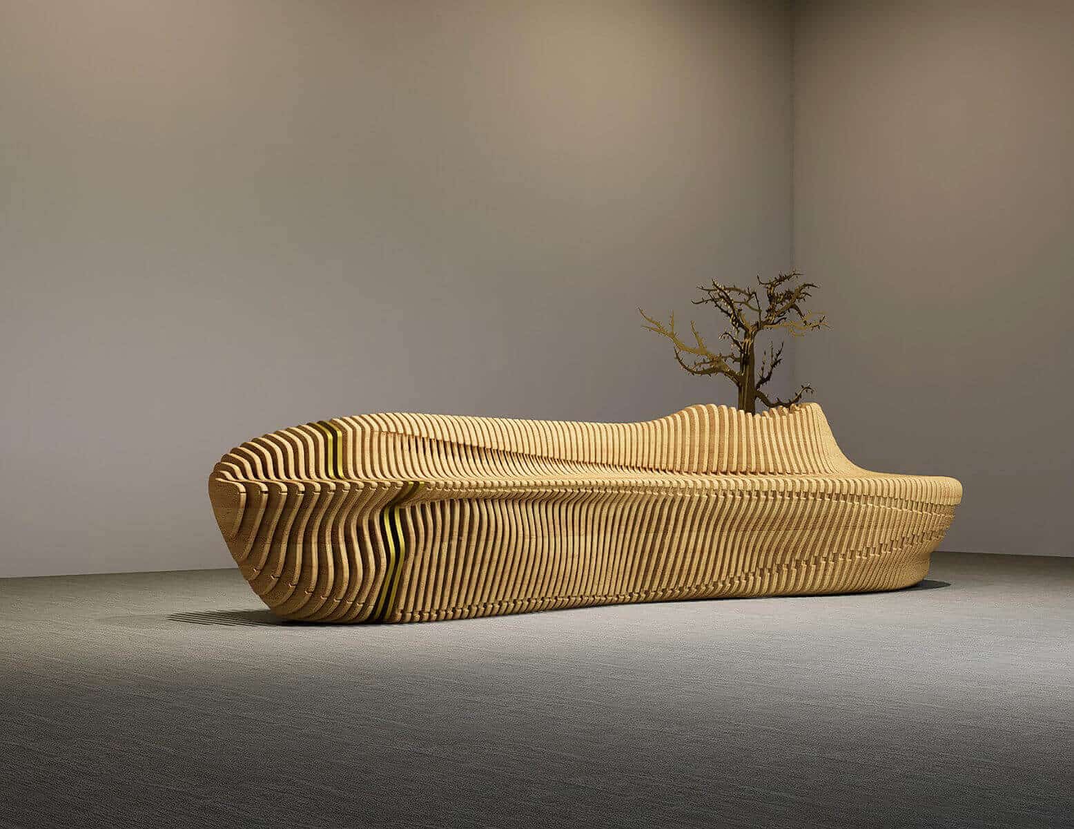 This sculptural bench explores the intersection of geometry, material warmth, and quiet growth. Composed of layered pinewood ribs, the form emerges from a parametric logic where repetition becomes rhythm and structure becomes surface. Each contour is generated through incremental variation — a choreography of slices that transforms a digital gesture into a tactile landscape. At its core, the bench is not merely an object of rest but a spatial experience. The flowing topology invites pause, guiding the body along a continuous curve that dissolves the boundary between furniture and sculpture. The tactile grain of pinewood lends warmth and familiarity, grounding the computational form in a natural material memory. Emerging from the heart of the structure is a delicate brass tree — a quiet but deliberate intervention. Unlike the organic unpredictability of nature, this tree is rendered in metal, symbolising permanence within growth and stillness within motion. It acts as both anchor and metaphor: a reminder that life persists even within engineered geometries. The contrast between soft wood and reflective brass creates a dialogue between time scales — the ephemeral and the enduring, the handtouched and the machine-shaped. While the bench embodies fluid continuity, the tree introduces a moment of vertical interruption — a pause within flow.