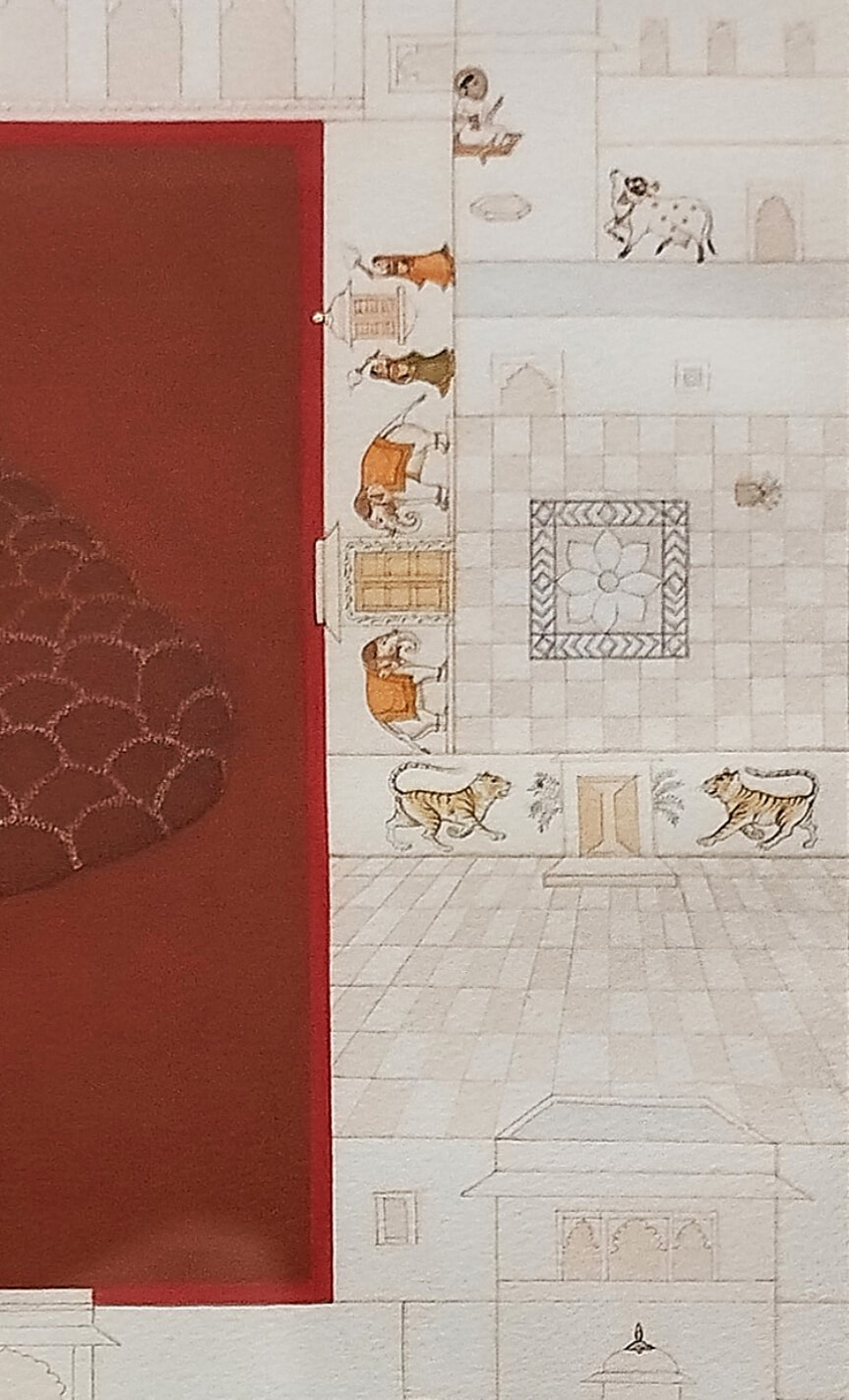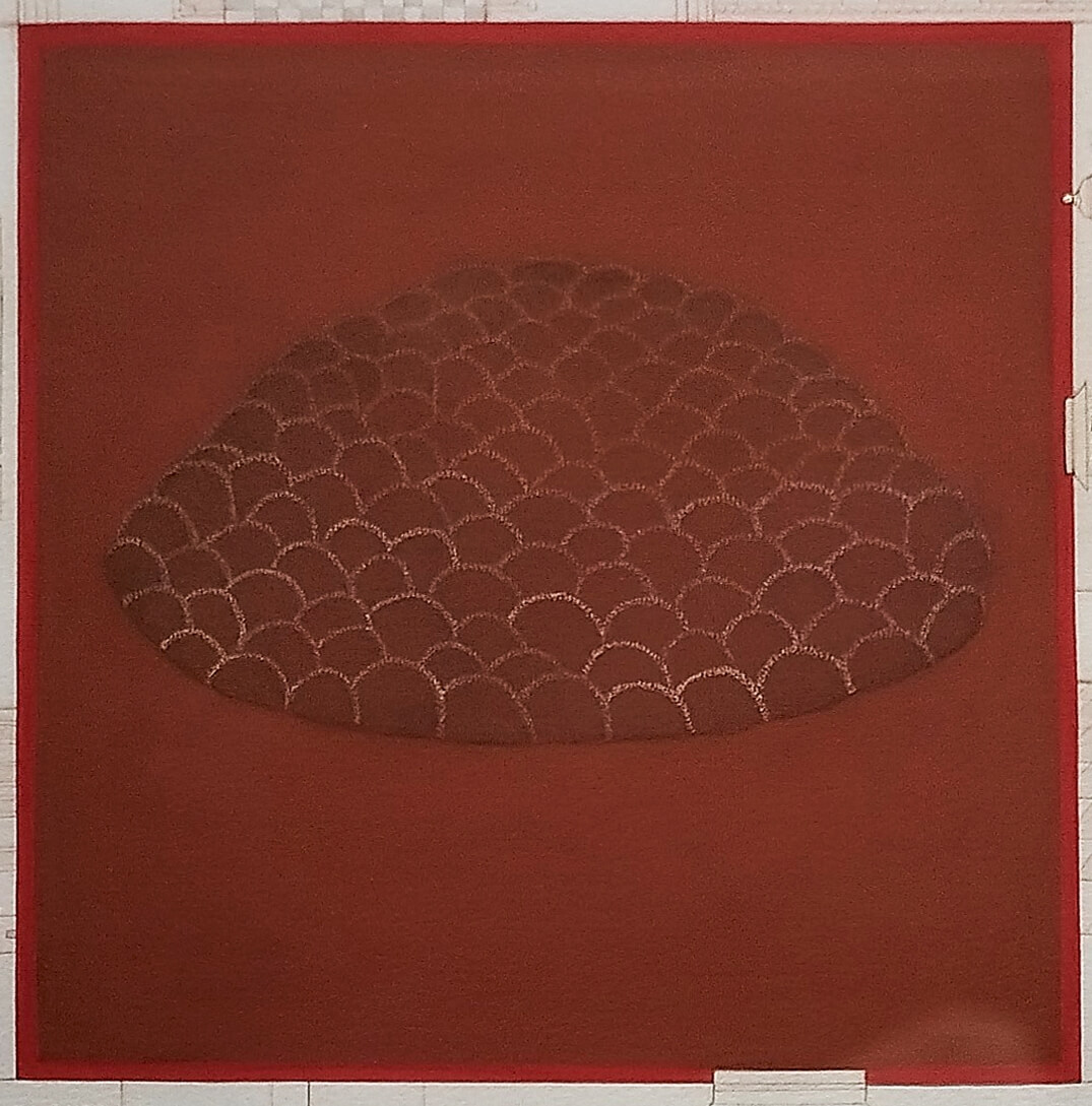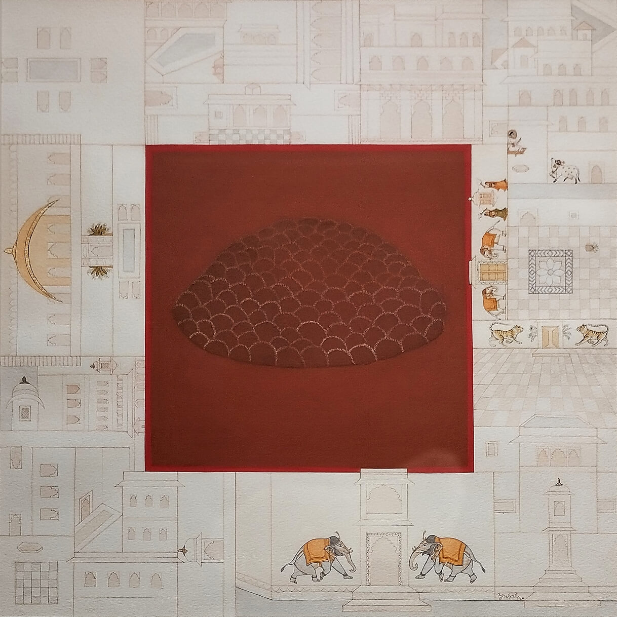This painting beautifully merges traditional architectural aesthetics with contemporary abstraction, creating a dialogue between heritage and modern expression. The composition centers around a rich red square, containing a textured, dome-like pattern that evokes the rhythmic tiles or motifs often seen in classical Indian architecture. Surrounding this focal form, the artist delicately illustrates an intricate haveli — complete with arches, courtyards, domes, and stairways — rendered in fine, minimal lines and soft earthy tones. The inclusion of elephants, cows, and ornamental motifs brings life to the architectural setting, symbolizing culture, ritual, and daily rhythm. The juxtaposition of the precise architectural drawings with the bold, meditative central form suggests a balance between structure and spirituality, material and metaphysical. Through this refined interplay of space, geometry, and symbolism, the artist evokes a timeless sense of nostalgia, inviting the viewer to contemplate India’s layered history and the poetic beauty of its living architecture.
