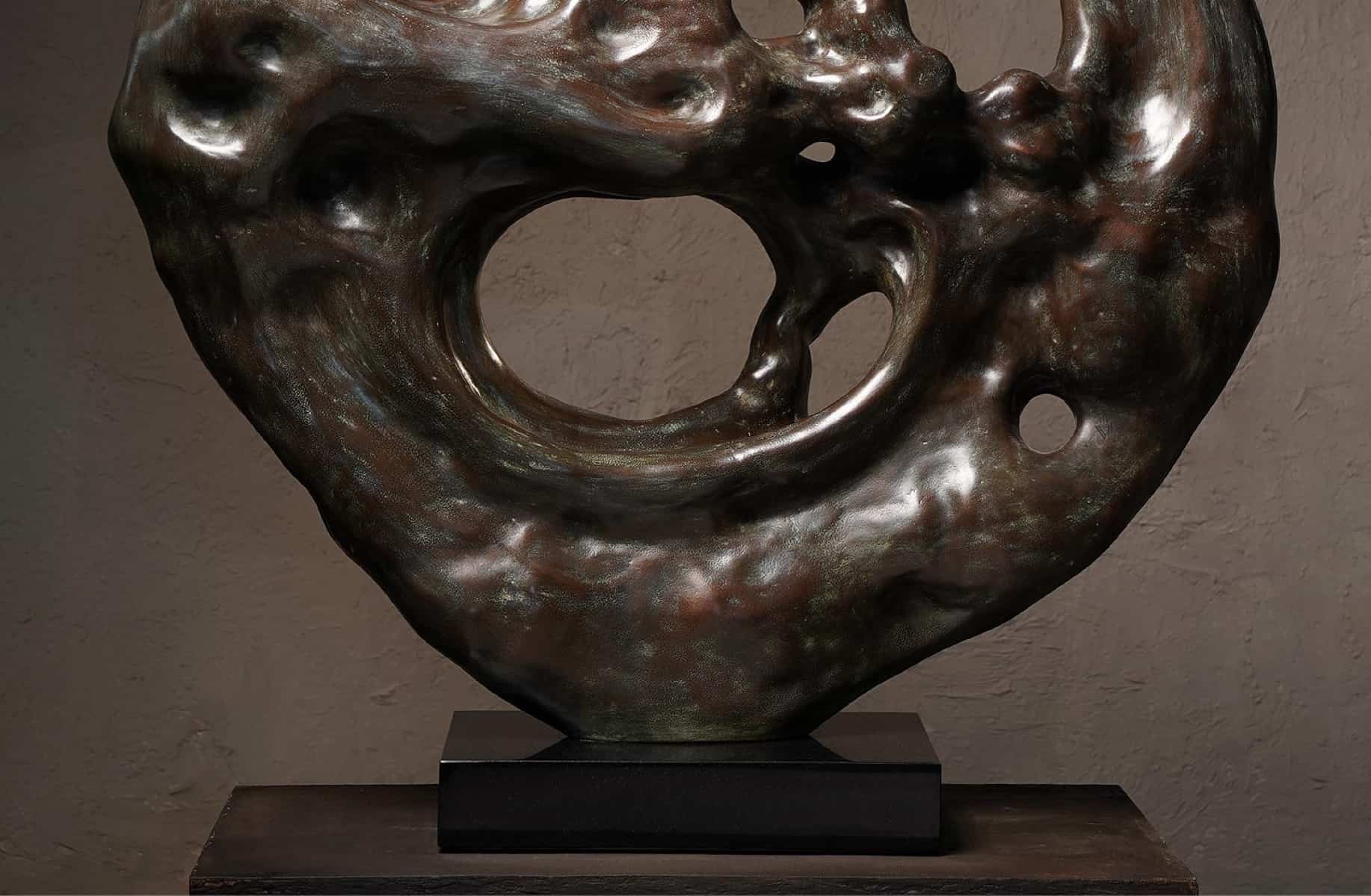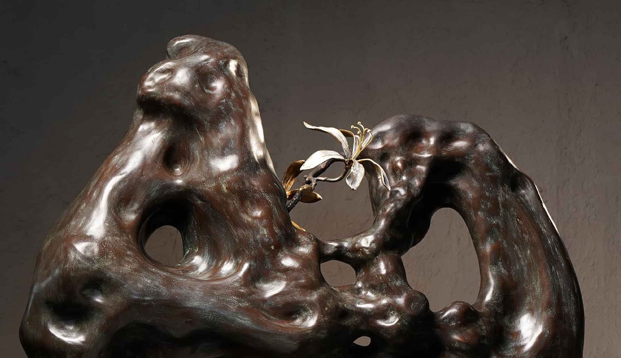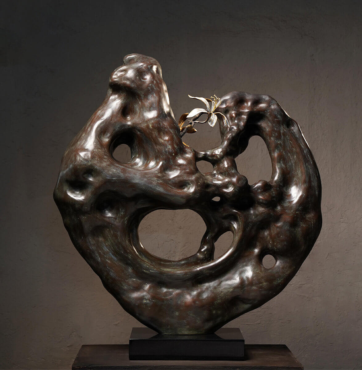 The New Beginning is an organic sculpture shaped by time and life’s journey, adorned with a delicate branch of blossoms. Its shifting voids and contours evoke past struggles and future longings converging to forge a renewed present.