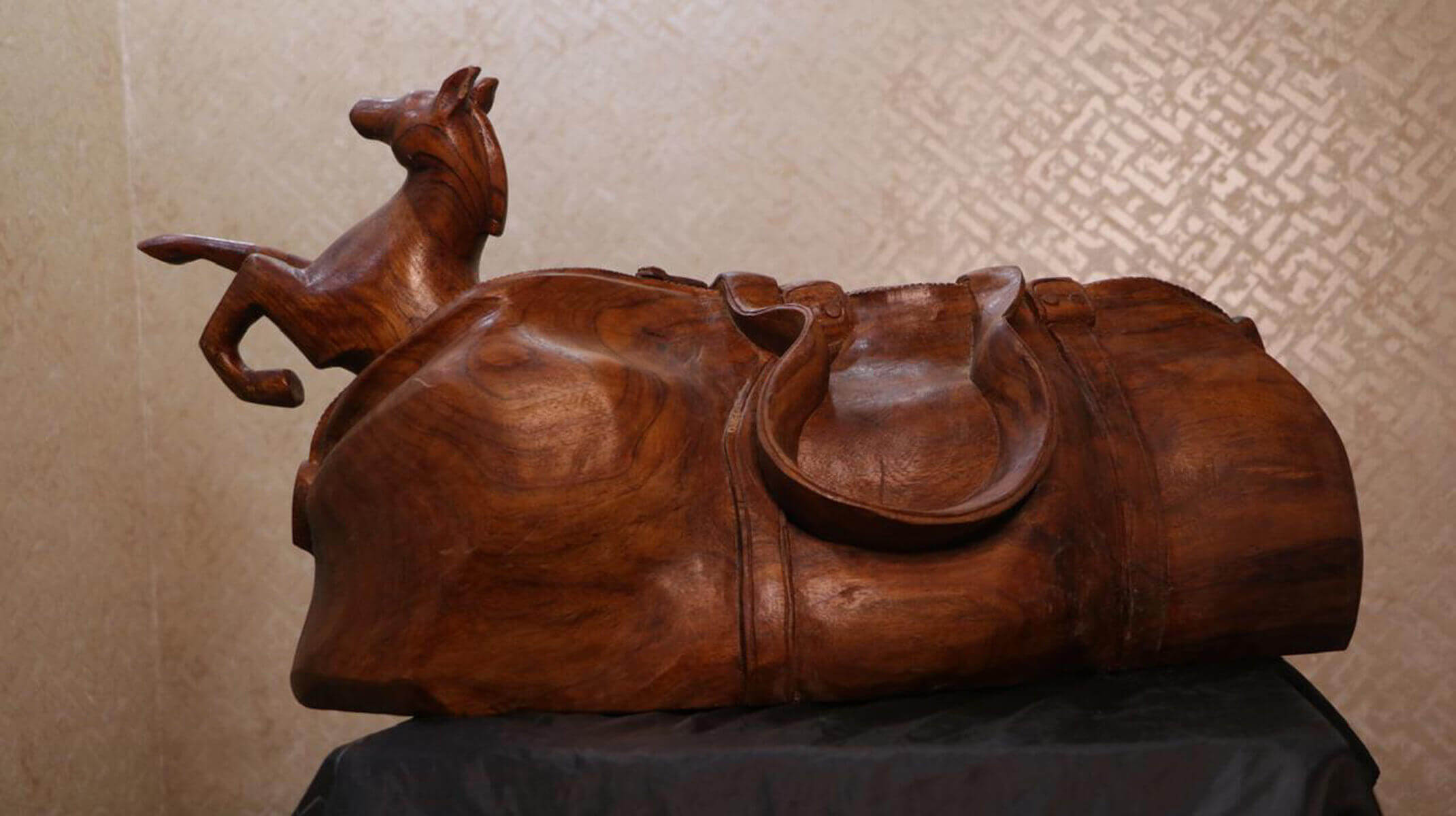 Prodigal Son rises from reclaimed wood’s raw memory, where a spirited horse — prodigal archetype of rebellion and return — leaps boldly from the duffel’s embrace. Untethered yet rooted, its rearing form defies confinement, embodying the soul’s odyssey: departure, reckoning, homecoming. In this intuitive carve, I honor resilience, the wild heart’s circuitous path to wholeness.