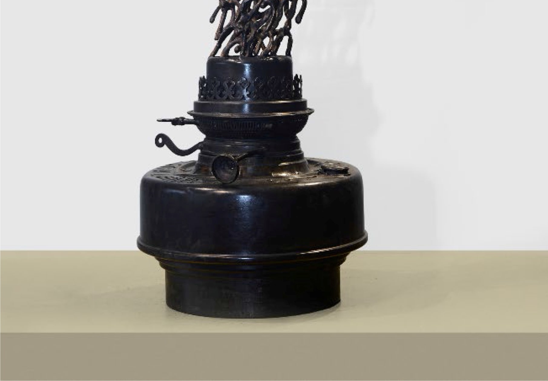 “Tune of the Flame” by K.S. Radhakrishnan is a 2017 bronze sculpture that transforms an antique lamp into a poetic form, where flame-like intertwined figures rise gracefully, symbolizing movement, energy, and the essence of life.