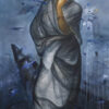 The monochromatic drapery flows around her like a protective layer, its folds rendered with delicate precision. In contrast, the background carries expressive splashes and textured drips of blue and muted tones, suggesting memory, rain, or an emotional landscape rather than a physical one. The interplay between the calm figure and the restless backdrop creates a subtle tension — as though she stands composed amidst the turbulence of the world around her.