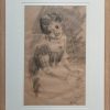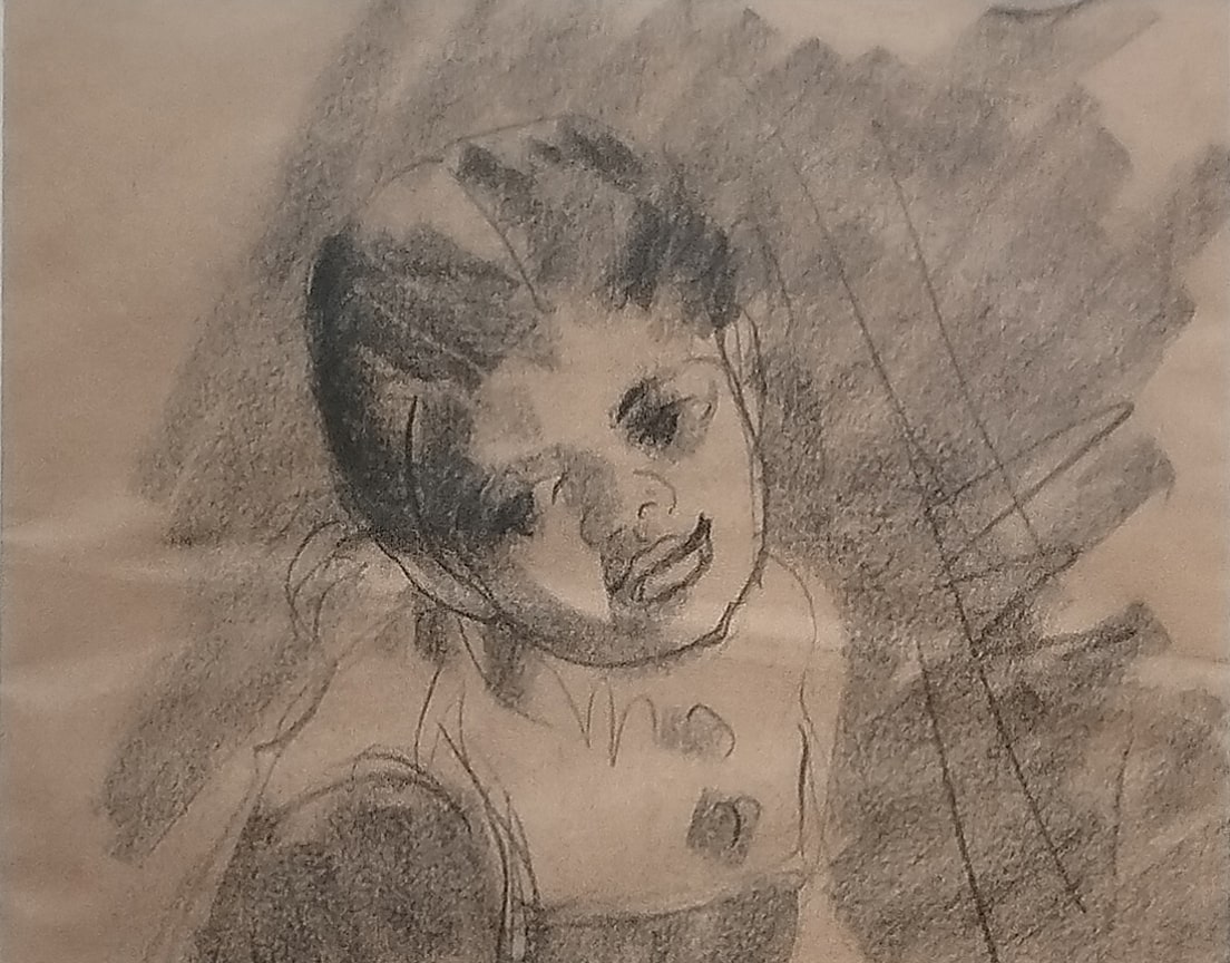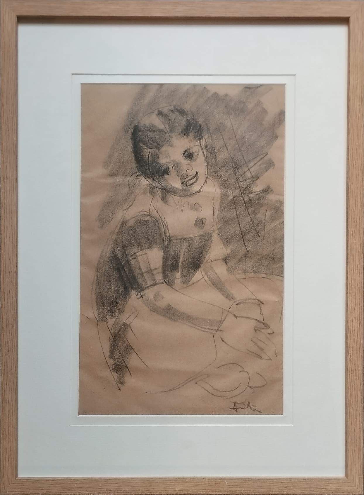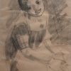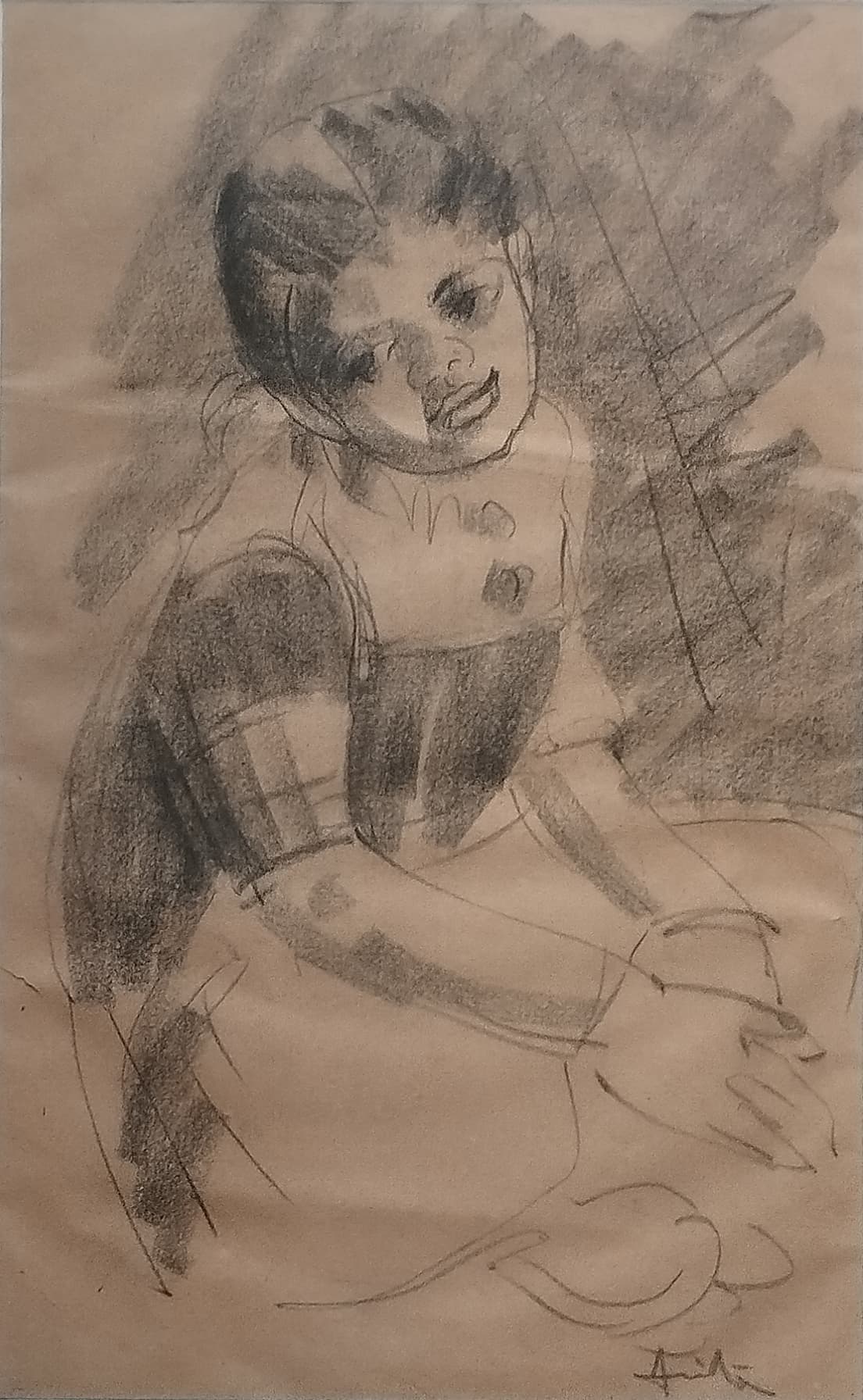 This charcoal drawing by Anita Roy Chowdhury, dated 1960, captures the expressive innocence of a young girl seated with folded hands. Executed in fluid strokes and soft shading, the portrait emphasizes the girl’s gentle posture and endearing gaze, which seems to engage the viewer directly. The artist masterfully conveys personality and mood with minimal lines—her tilted head, the relaxed composure, and faint smile exude a quiet warmth. There’s an effortless grace in the sketch, suggesting Anita Roy Chowdhury’s deep sensitivity to human expression and childhood charm. The backdrop, loosely textured with charcoal, draws focus to the subject’s face and emotion, creating an intimate moment frozen in time.