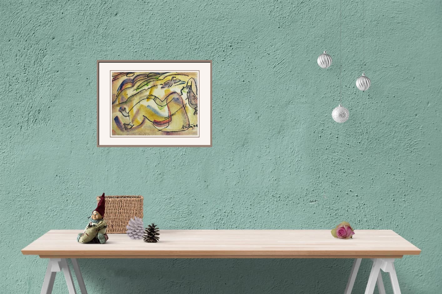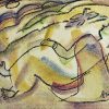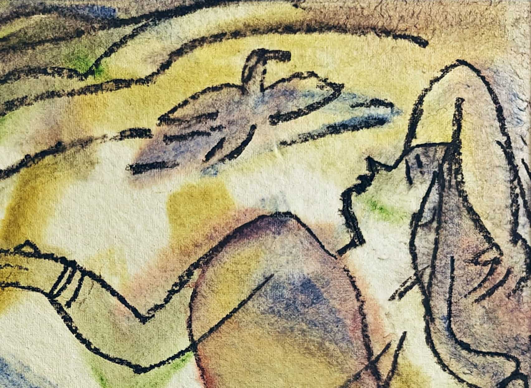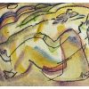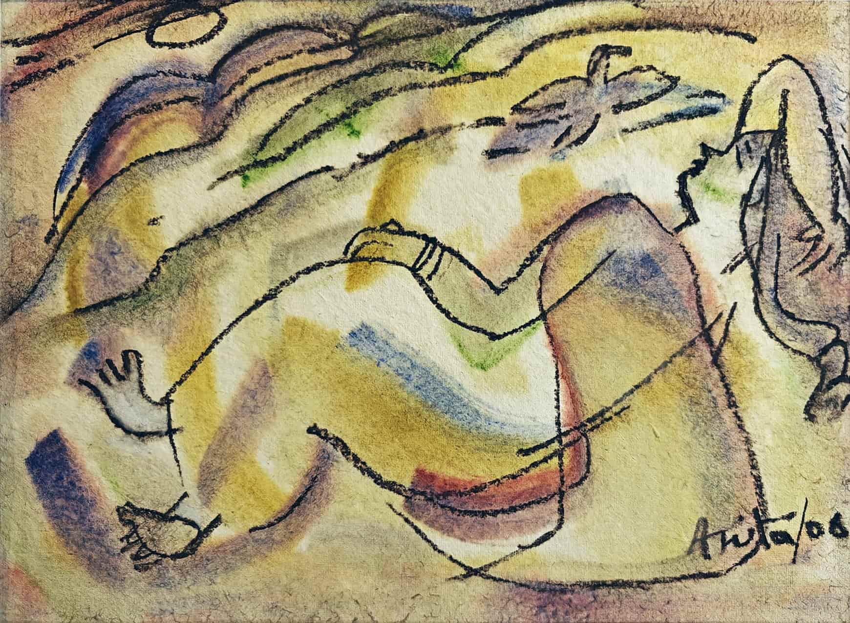 This vibrant mixed media painting by Anita Roy Chowdhury, dated 2006, is a lyrical composition that blends fluid linework with soft washes of color to evoke a dreamlike atmosphere. The reclining female figure, outlined in expressive black contours, appears to be in a state of rest or contemplation amidst an abstract, undulating landscape. Hints of flora, flowing forms, and a floating butterfly add to the ethereal quality of the scene. The subtle interplay of warm and cool tones—yellows, purples, greens, and blues—infuses the work with emotional depth and visual rhythm. The figure, though stylized, retains a strong presence, embodying both tranquility and connection with nature. Chowdhury’s intuitive approach allows the viewer to feel rather than analyze, making this painting a quiet celebration of form, color, and inner stillness.