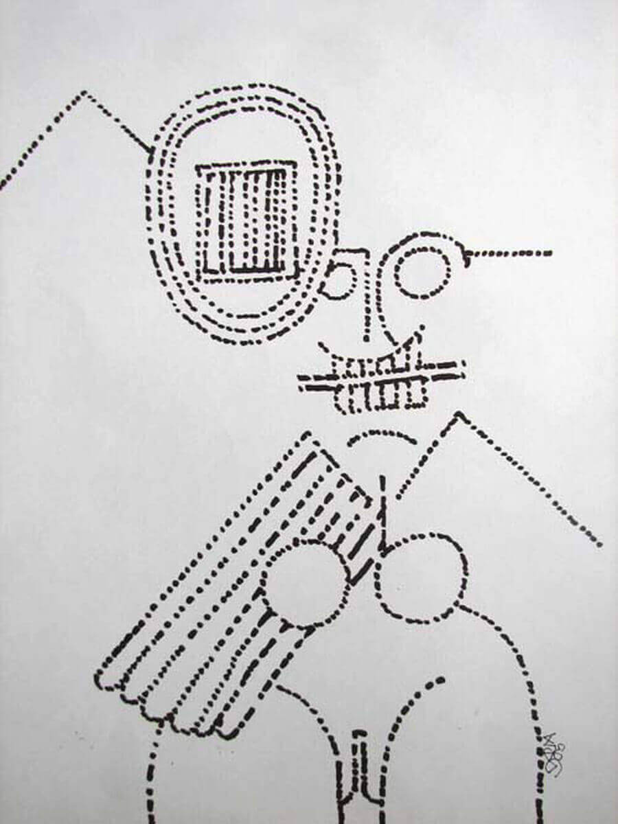 This untitled ink-on-paper work by Prokash Karmakar (2006) is a striking example of how simplicity can carry profound character. Created entirely through rhythmic dotted lines, the composition reveals a stylized human figure that feels both playful and enigmatic. The artist abandons solid contours, instead building the form through carefully placed marks — each dot contributing to a larger visual pulse.