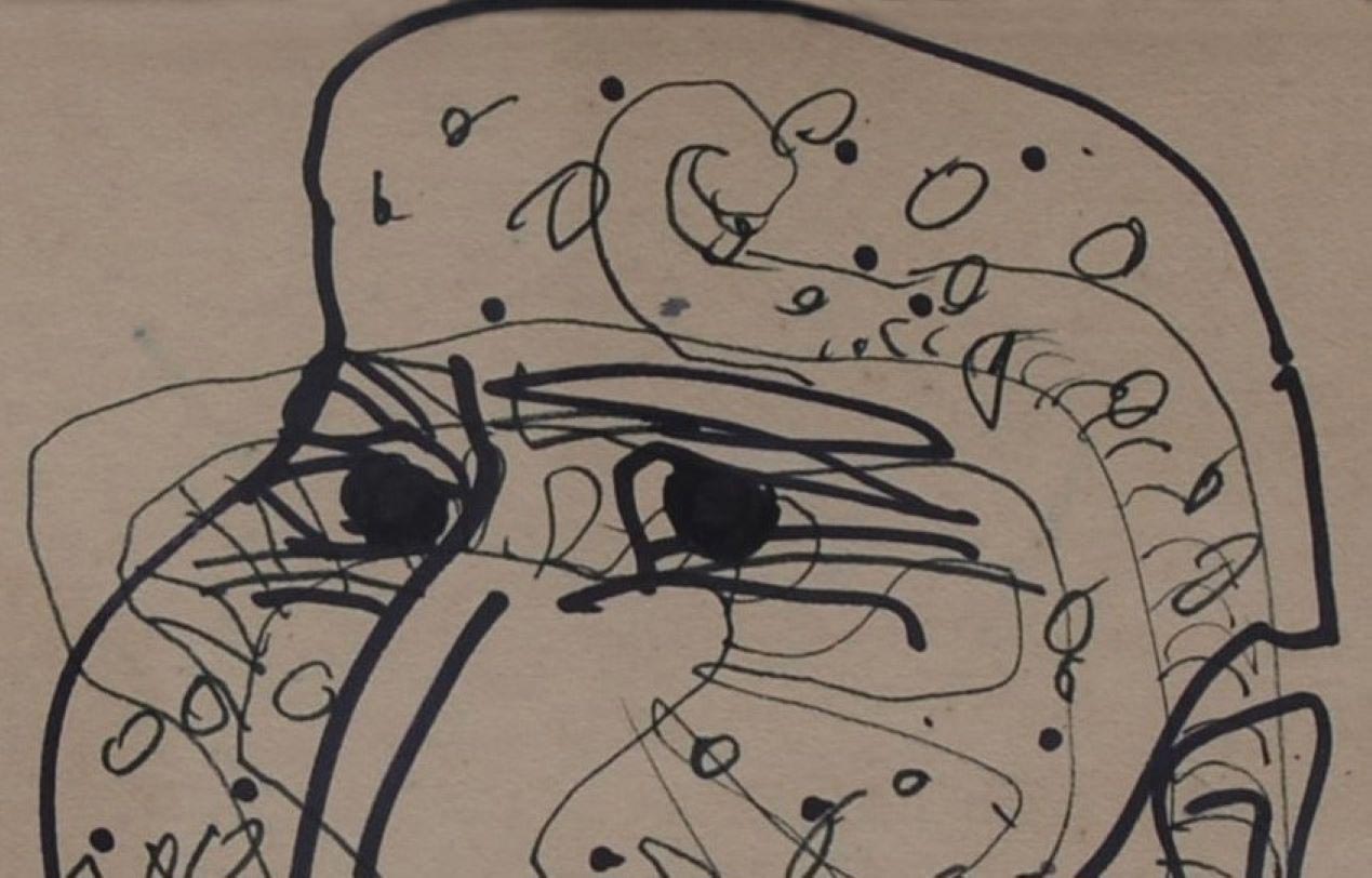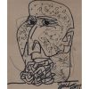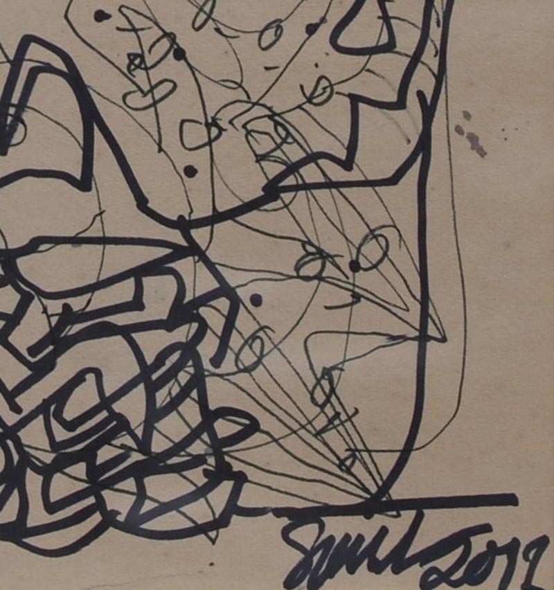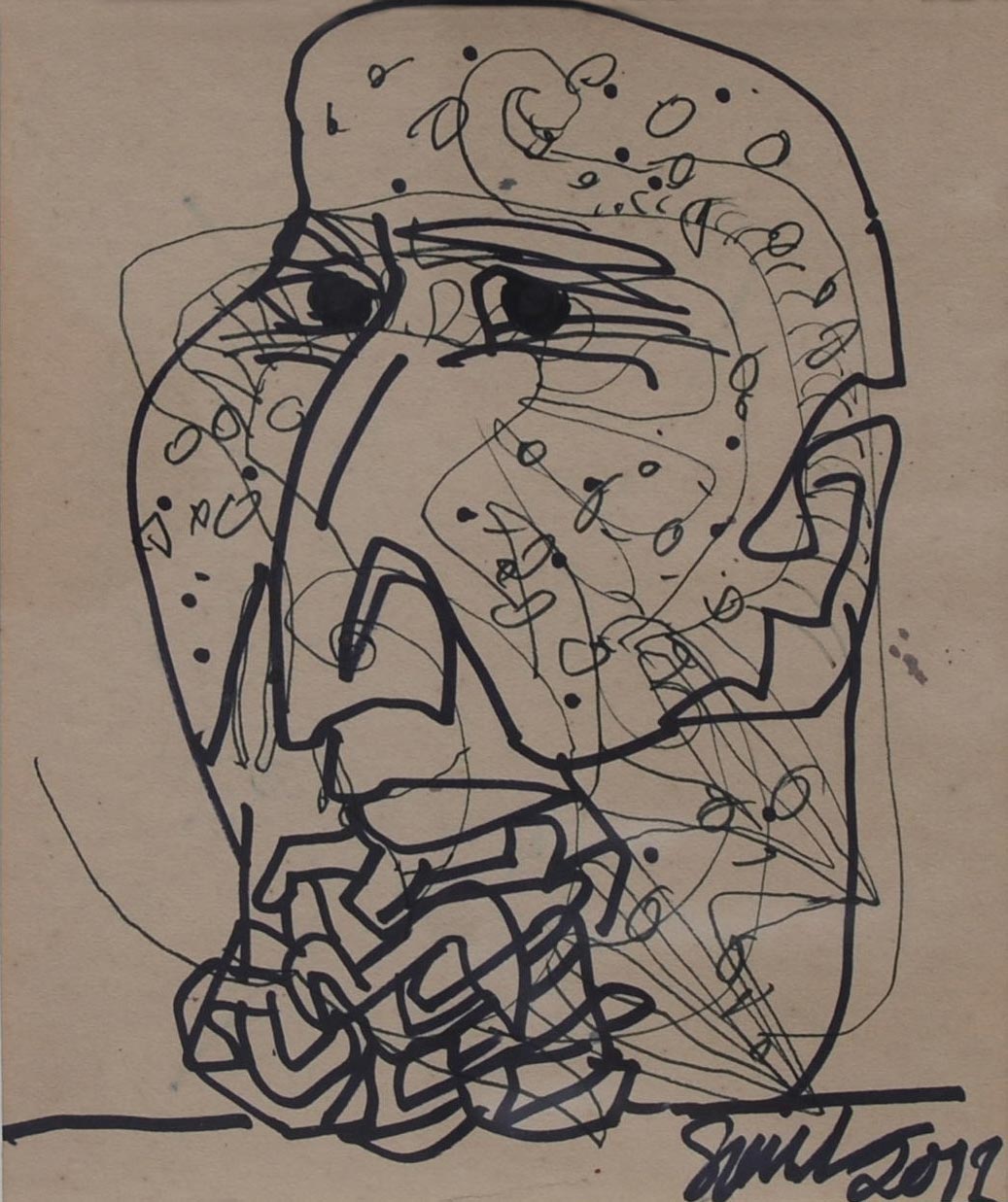 This untitled ink on paper work by Sunil Das, created in 2011, is a compelling example of the artist’s expressive and gestural line work. Known for his emotionally charged portraits and figures, Das presents here a stylized human face rendered in bold, black ink strokes, layered with swirling and erratic lines that suggest movement, turmoil, or layered thought. The exaggerated features—particularly the deep-set eyes and prominent nose—create an intense psychological presence, while the abstract overlays bring a sense of restlessness and introspection. The raw, spontaneous nature of the drawing aligns with Sunil Das’s signature approach, where figuration meets abstraction in a dynamic, almost performative act of mark-making.