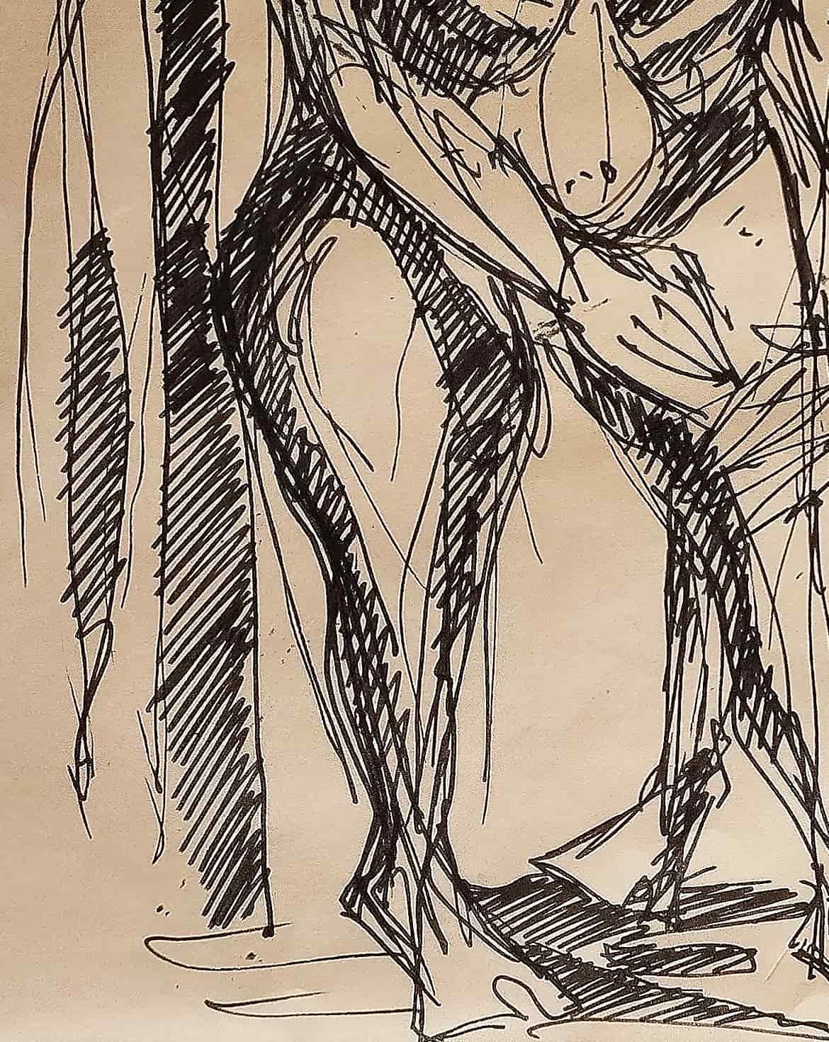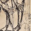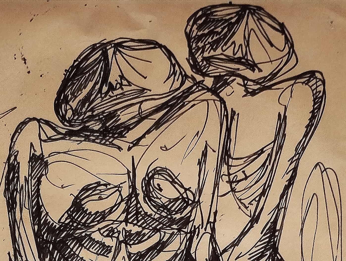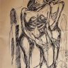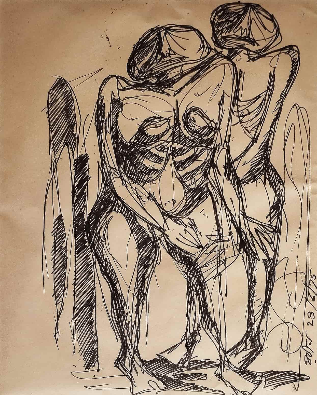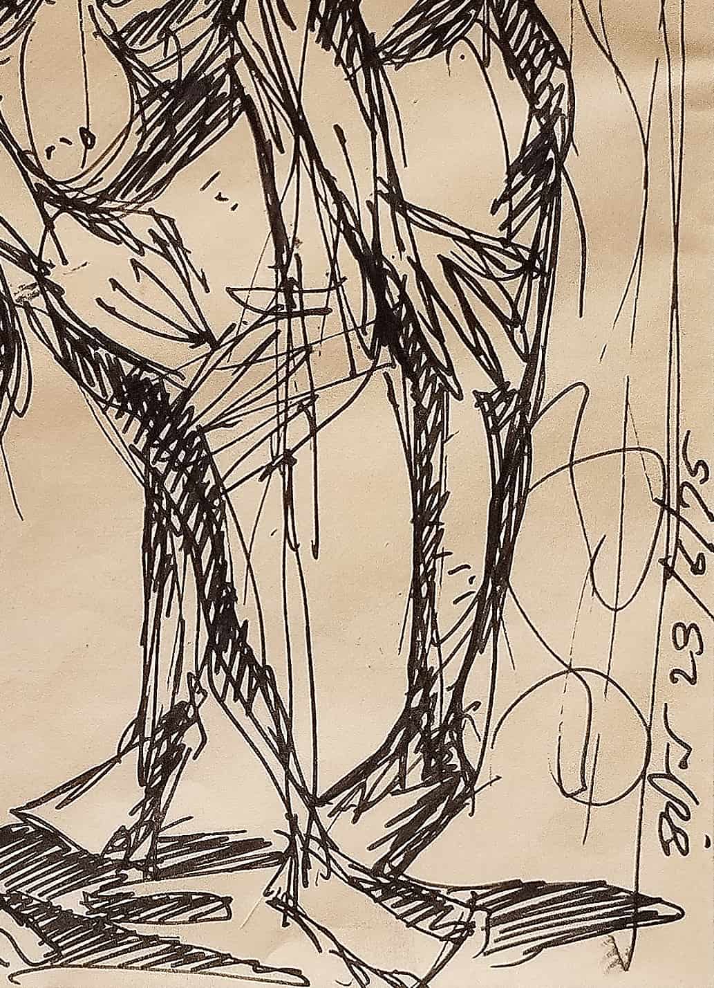 This powerful ink drawing by Rabin Mondal, created in 1996, exemplifies his expressionist approach to the human figure. Executed in raw, almost frantic black lines on paper, the work portrays two contorted, skeletal-like nude figures seated in a posture of fatigue, vulnerability, or despair. The figures, stripped of identity and reduced to exposed anatomy, resonate with themes of suffering, marginalization, and existential anxiety—central motifs in Mondal’s body of work. Their hollow eyes, angular limbs, and slumped shoulders evoke a disturbing quietude, highlighting the emotional and psychological toll of oppression. The background is left deliberately sparse, allowing the figures to dominate the composition and confront the viewer directly. This drawing, though minimal in material, is monumental in emotional weight, capturing the haunting intensity for which Rabin Mondal is widely recognized.