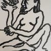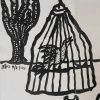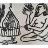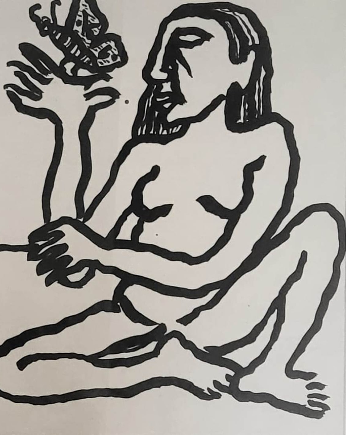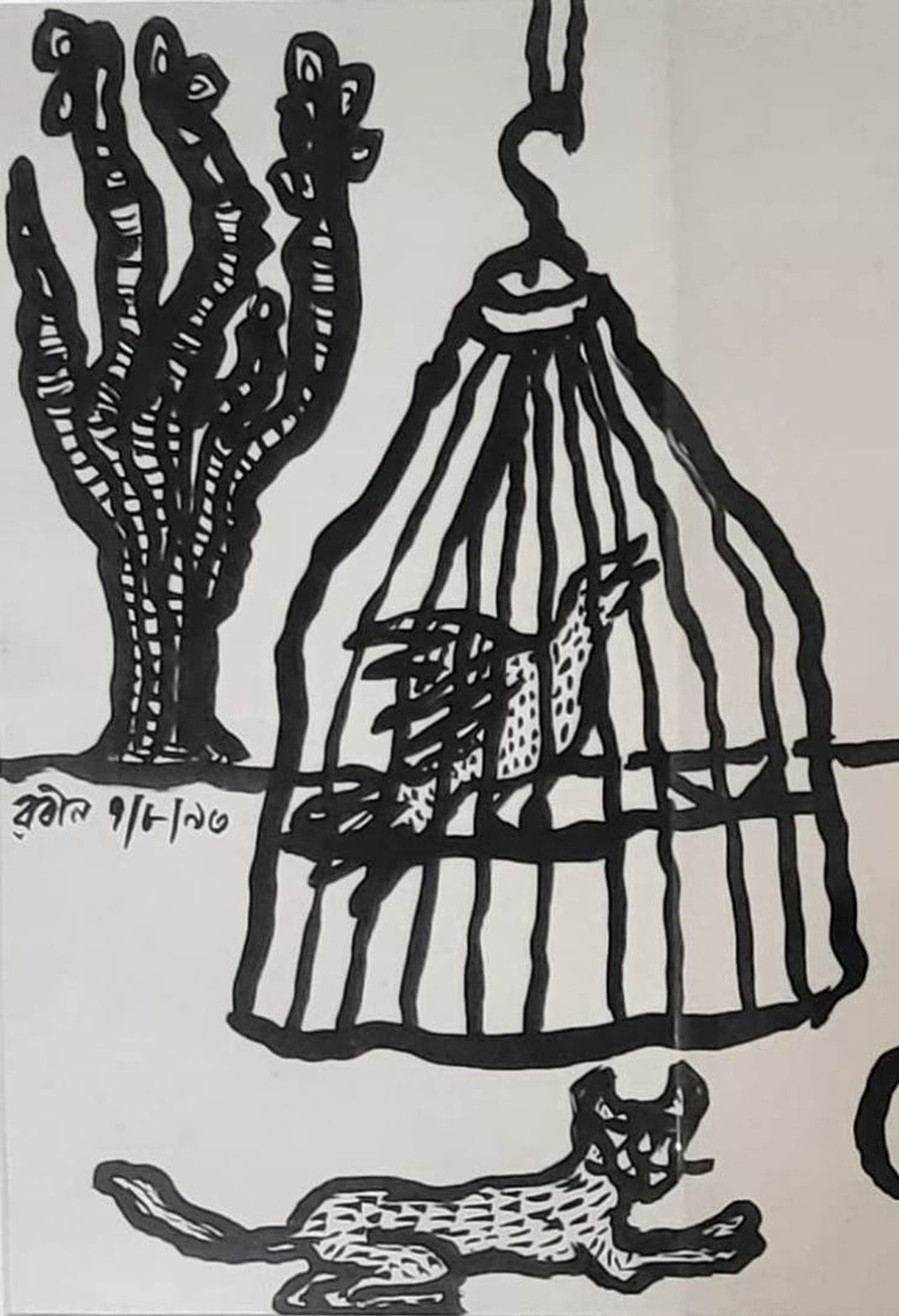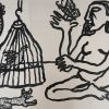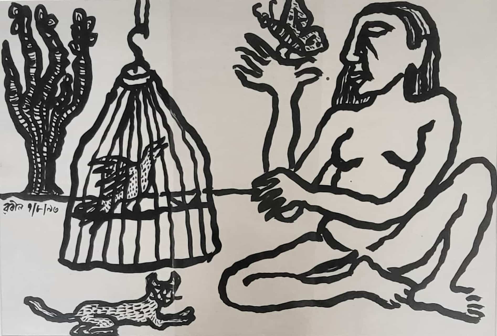 This 1993 ink on paper work by Rabin Mondal is a compelling blend of symbolism and expressionist figuration. In stark black lines on a white background, a nude human figure dominates the composition, surrounded by animals and objects—a caged bird, a butterfly, a cat, and a spiky tree. The imagery suggests an intricate relationship between freedom and entrapment, nature and human vulnerability. The figure, seated cross-legged, gazes intently at the butterfly perched delicately on an outstretched hand, offering a stark contrast to the bird confined within the cage. The cat, often a symbol of watchfulness or independence, lies nearby, adding to the layered narrative. Mondal’s bold, almost primitive linework and minimal background evoke a dreamlike space where psychological and symbolic elements converge. It’s a visual meditation on confinement, longing, and the fragile balance between control and liberation.