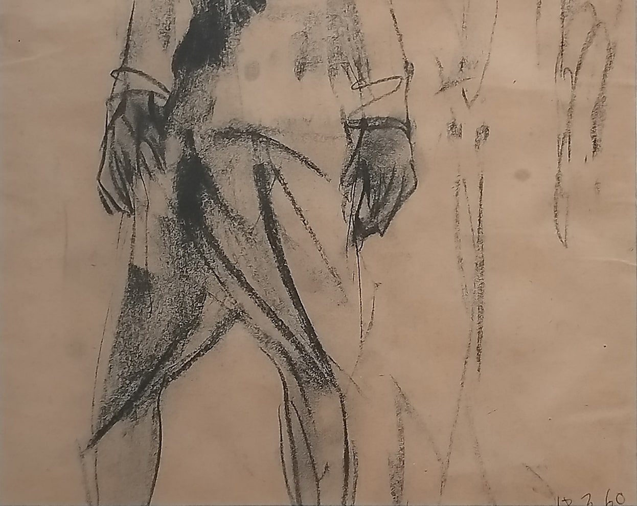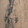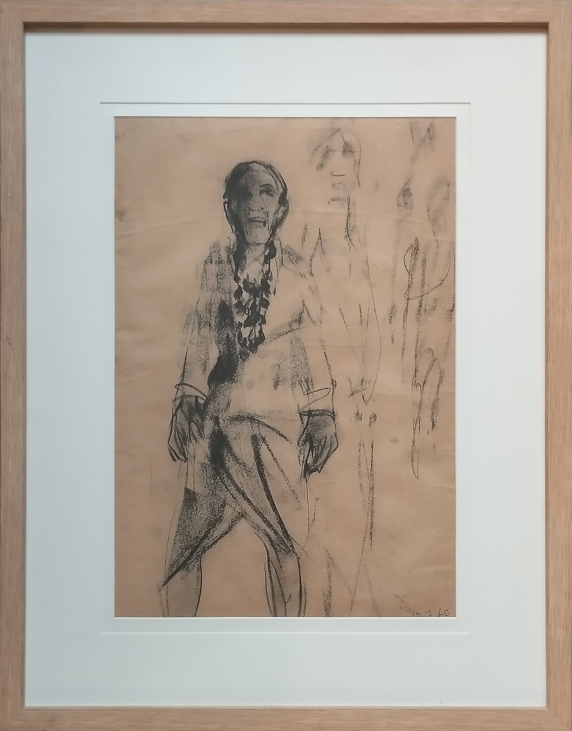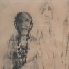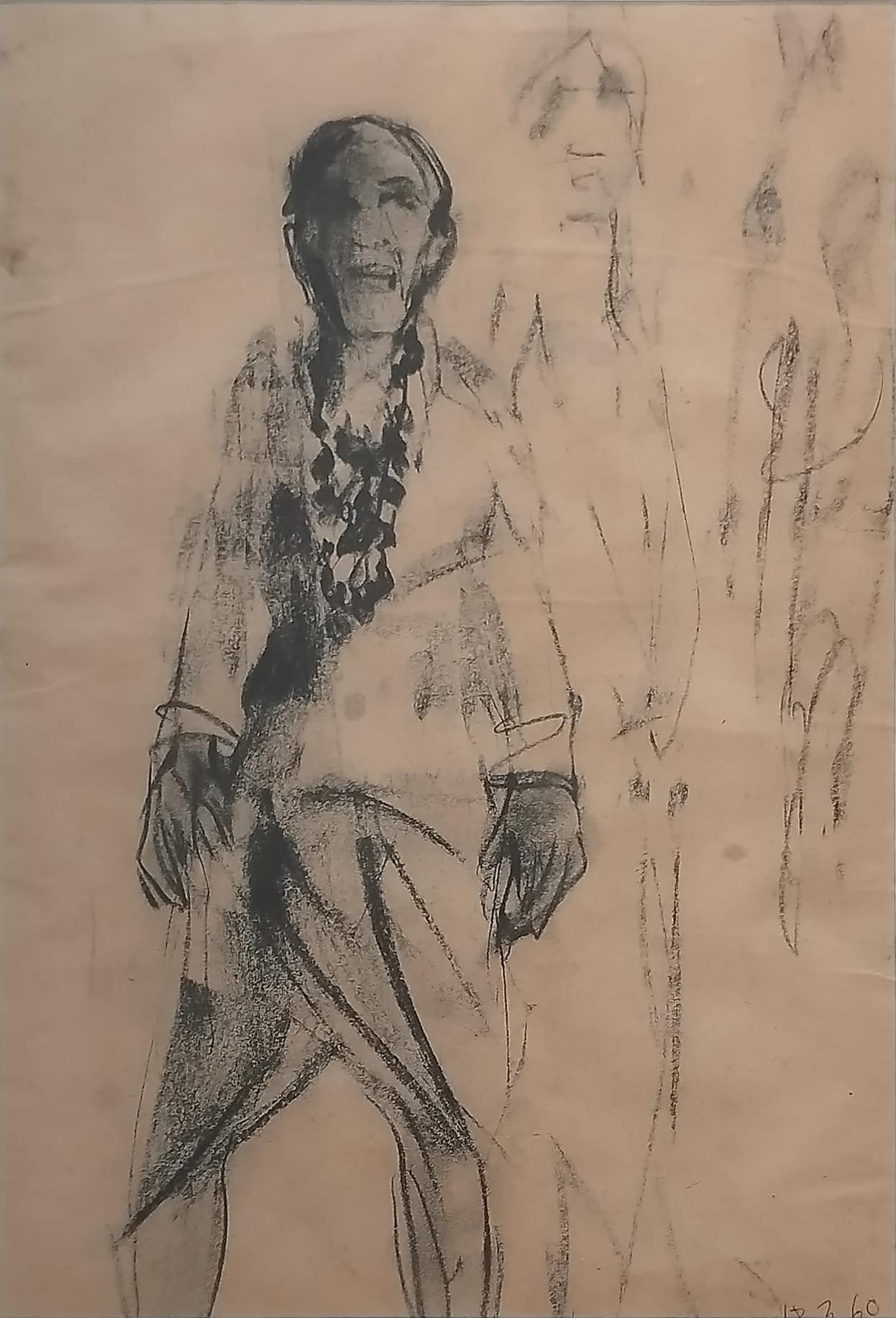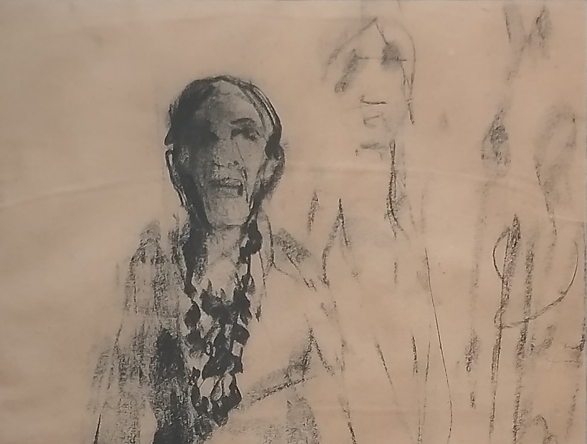 This charcoal drawing by Anita Roy Chowdhury, dated 1960, reflects a quiet intensity that is both intimate and observational. The central figure, likely a woman, is portrayed in a frontal stance, her body grounded yet soft, with facial features partially obscured in shadow. The expressive use of charcoal creates a dramatic contrast between light and dark, suggesting both physical presence and emotional weight. Her braided hair, rendered with care, adds a personal and cultural dimension to the portrait, while the ghostly outlines of secondary figures in the background hint at memory, identity, or a fleeting moment in time. The sketchy, gestural quality of the drawing captures the immediacy of the artist’s process and the raw human essence of the subject. This work speaks to Anita Roy Chowdhury’s sensitivity toward form, character, and the ephemeral nature of presence.