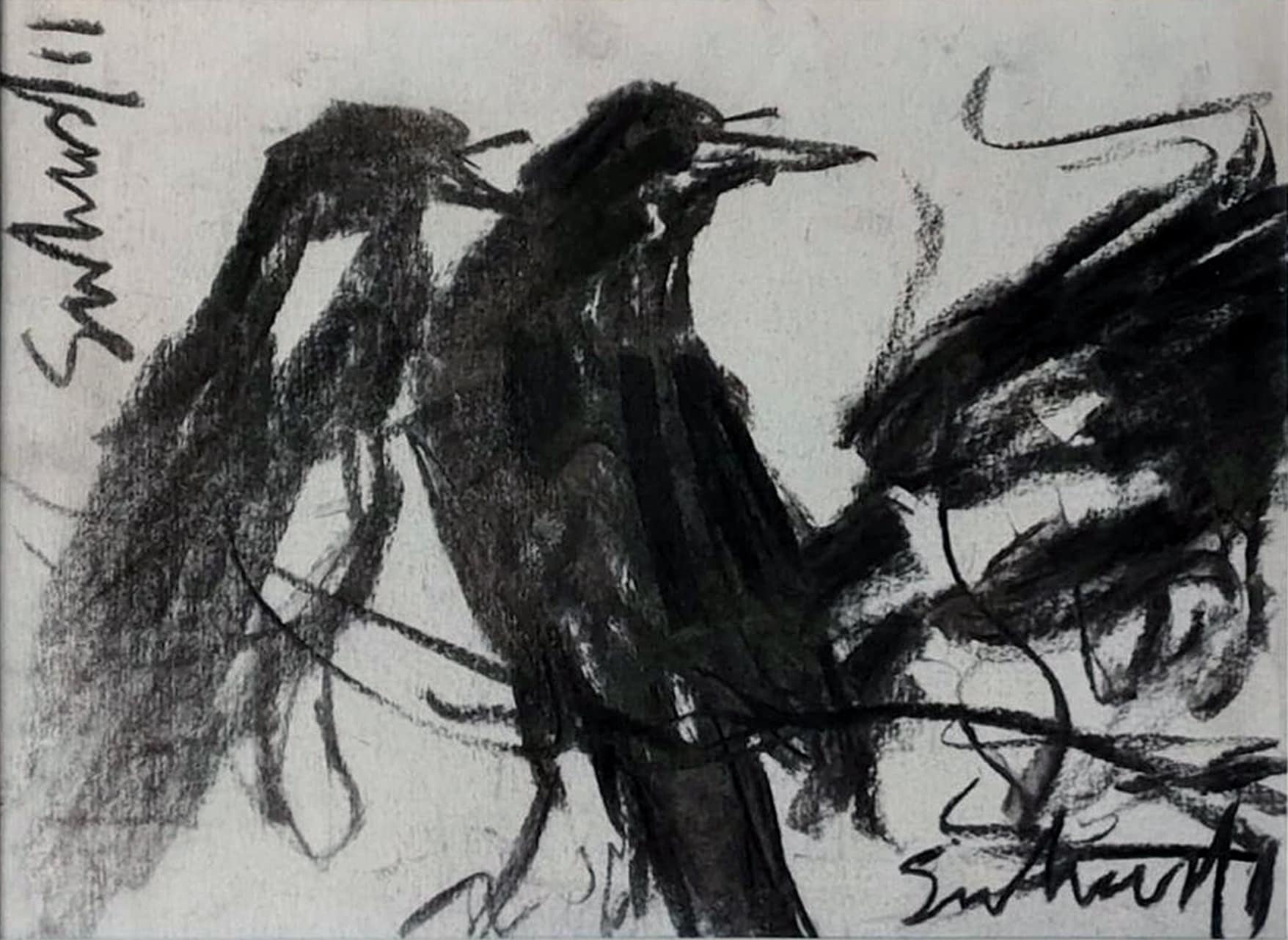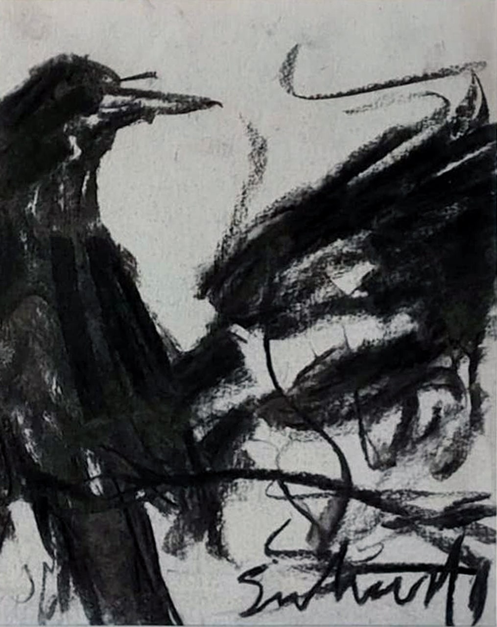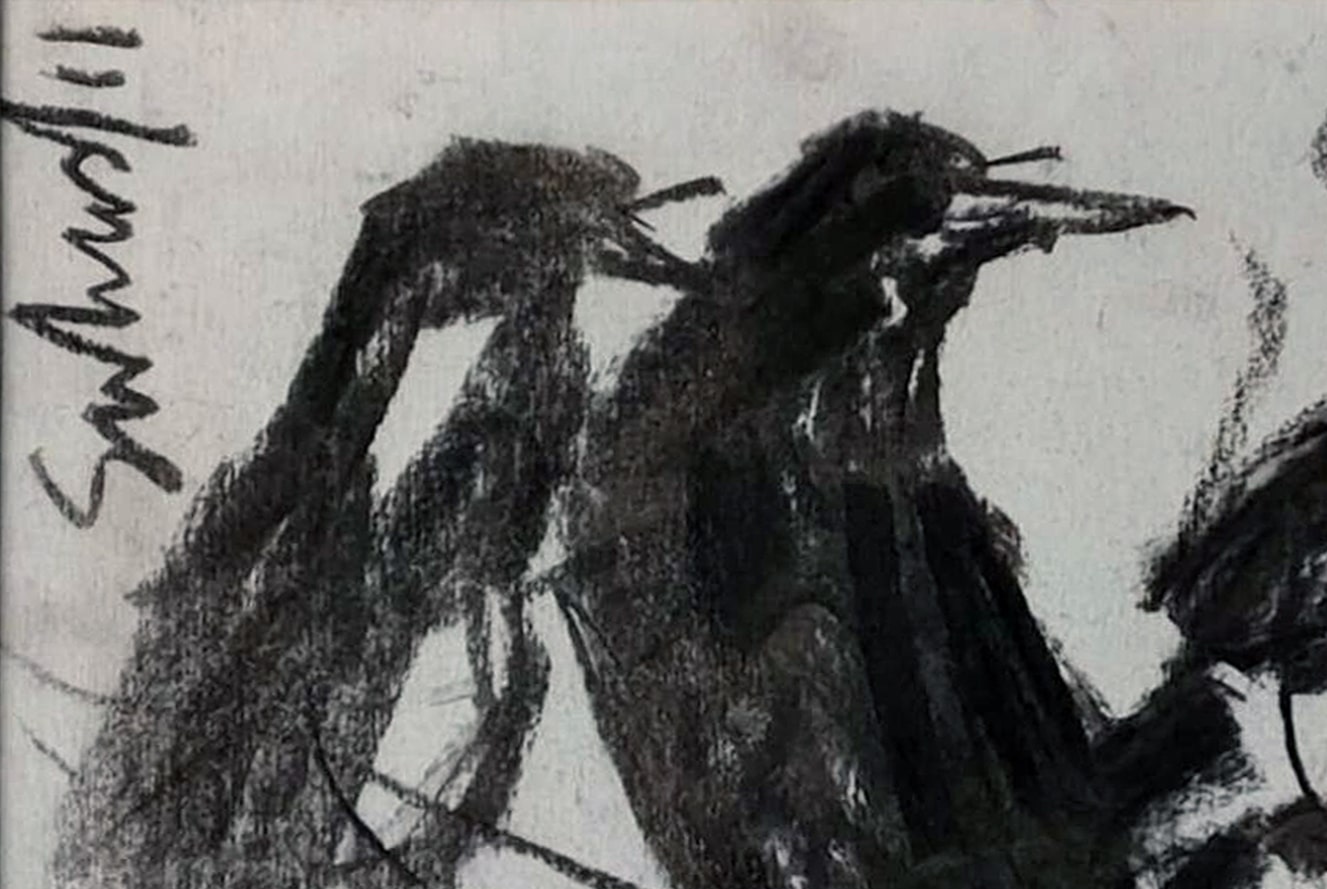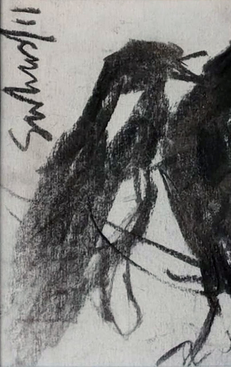 This artwork, created by Suhas Roy in 2011, is a striking charcoal on paper composition that captures the raw, expressive beauty of a bird in motion. With bold, sweeping strokes and smudged textures, the piece conveys a sense of vitality and freedom, while the stark black forms stand out against the light background. Roy’s gestural approach transforms the bird into a near-abstract form, evoking both the elegance and wild energy of nature. The minimal detailing allows the viewer’s imagination to fill in the gaps, making it as much about emotion and atmosphere as about the subject itself.