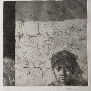This untitled work by F. N. Souza (1981) exemplifies the artist’s late-period engagement with the human visage as a site of psychological intensity and existential inquiry. Rendered in mixed media on paper, the composition is dominated by a stark, mask-like face drawn in assertive grey lines, floating against a turbulent, densely worked background. Souza’s linear contouring reduces the face to an almost skeletal geometry—hollow eyes, an elongated nose, and a grim, tooth-baring mouth—imbuing the figure with a haunting, confrontational presence. Behind this central visage, layers of gestural brushstrokes in deep reds, blues, blacks, and ochres churn restlessly, creating a visceral sense of emotional and spiritual unrest. The contrast between the rigid, emblematic face and the expressive, chaotic ground heightens the painting’s tension, reflecting Souza’s recurring themes of alienation, inner conflict, and the fractured nature of modern identity. The raw energy, unrefined surfaces, and expressive distortion firmly situate the work within Souza’s distinctive modernist language, where figuration and abstraction collide to produce a deeply unsettling yet compelling image.