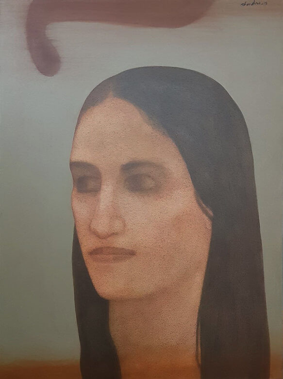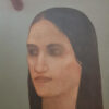 This evocative painting presents a serene female figure rendered in a soft, dreamlike style. The subject’s face, shown in gentle profile with closed eyes, exudes introspection and quietude. The artist employs a muted, earthy palette — subtle blends of warm ochres, soft greys, and pale greens — creating a tranquil, almost meditative atmosphere. The delicate gradation of tones and the smooth, almost mist-like texture lend the work an ethereal quality, as if the figure is emerging from memory or silence.