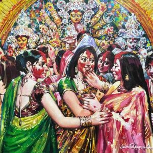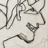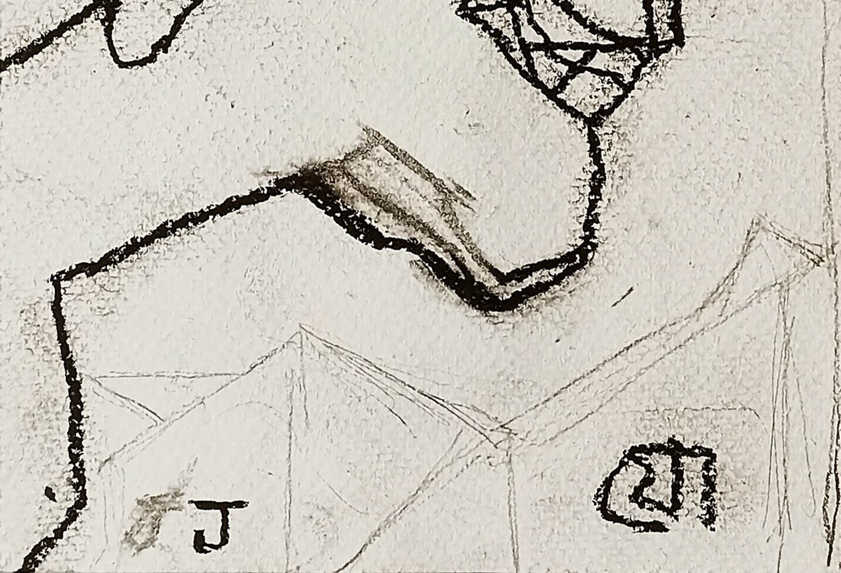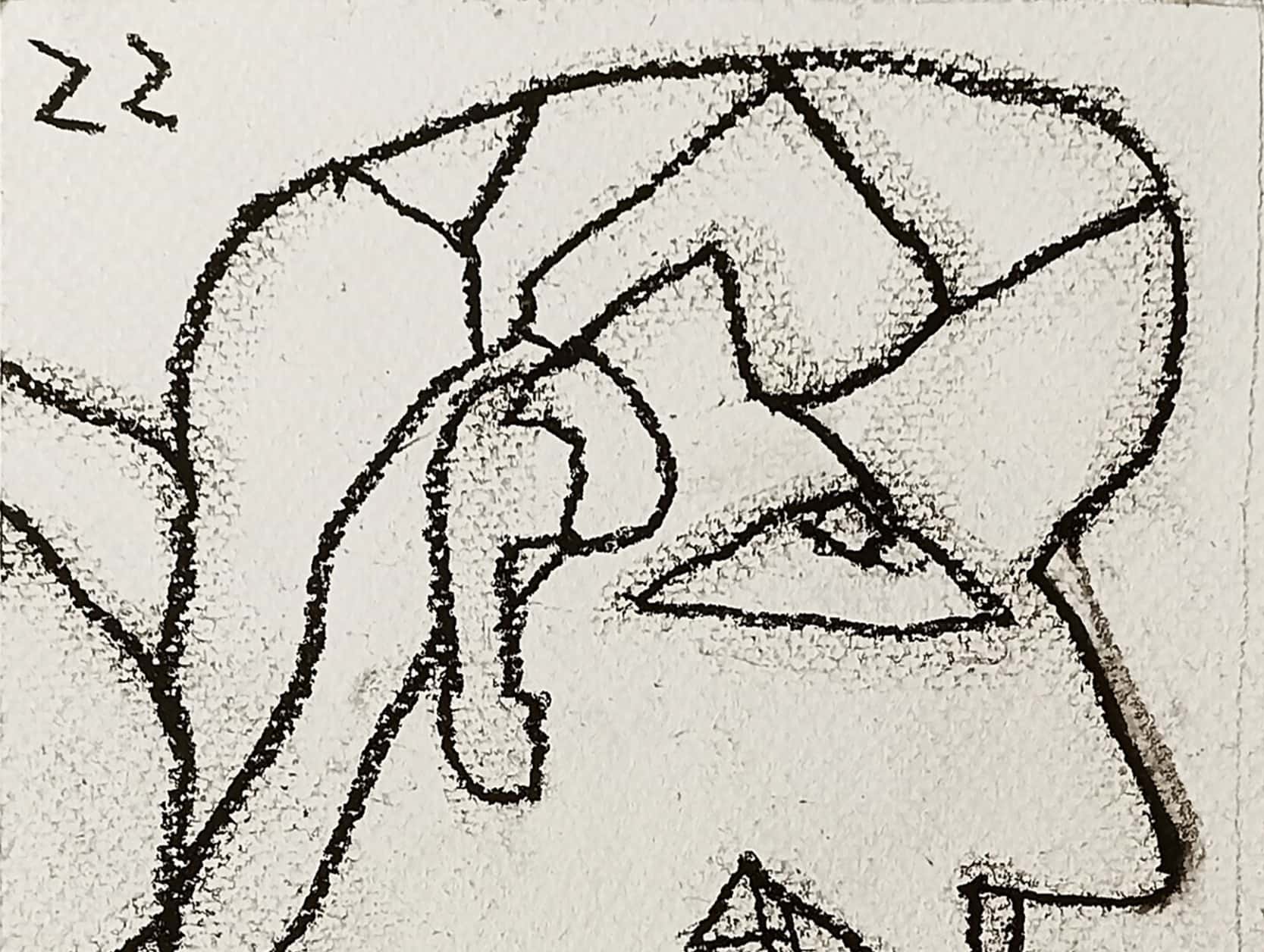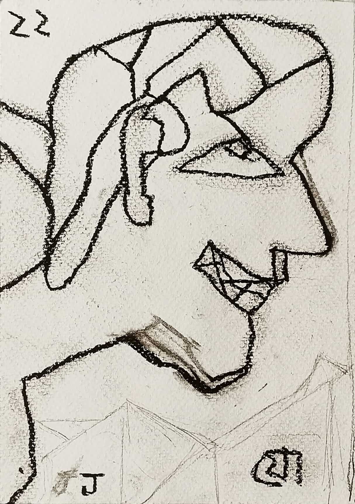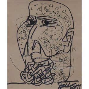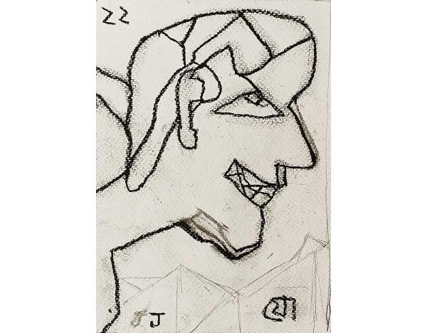 This untitled 2022 dry pastel on paper by Jogen Chowdhury exemplifies his characteristic fusion of abstraction and figuration. The work portrays a sharply contoured profile of a man, marked by jagged lines, exaggerated features, and an angular, almost cubist facial structure. The figure’s wide grin—with crisscrossed teeth—along with the bold eye and fragmented hair form, suggests a certain psychological complexity or irony. Chowdhury’s use of distortion isn’t merely stylistic but serves to convey a deeper emotional or social narrative. The presence of architectural or geometric forms in the background further adds layers of interpretation, possibly linking the individual to broader contexts—urban, cultural, or existential. The “Z” symbols, recurring in some of his recent works, may allude to sleep, silence, or subconscious states.