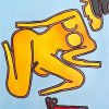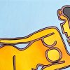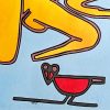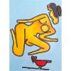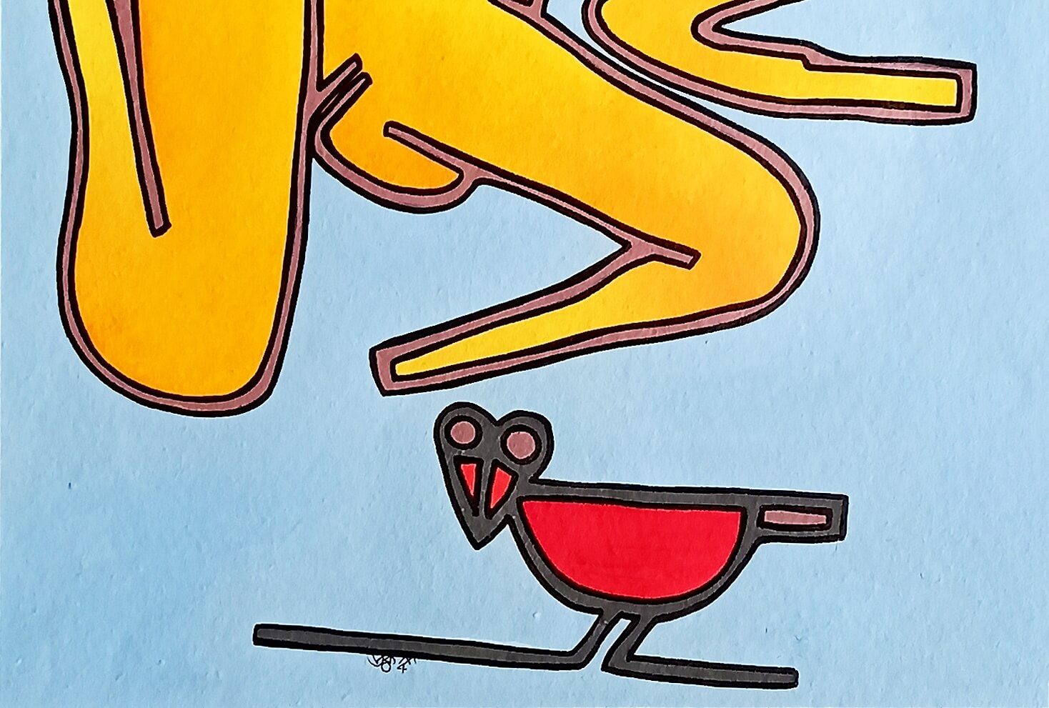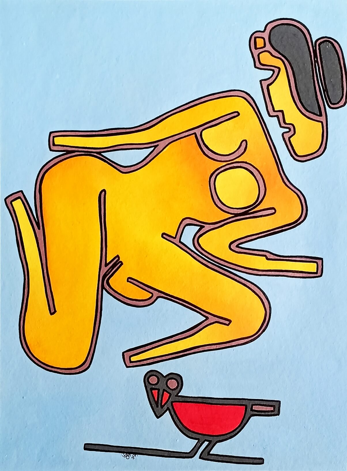 This painting presents a striking blend of abstraction and symbolism, rendered in bold outlines and vibrant colors. The central figure, formed through fluid, intertwined shapes in warm yellow and orange tones, evokes the image of a human body in a crouched, almost introspective pose. Its form seems to merge motion and stillness, as if caught in a moment of transformation or reflection. Above the figure, disjointed abstract elements float, suggesting fragmentation or the layering of thoughts and emotions. At the bottom, a small red bird adds contrast and balance, introducing a playful yet poignant element to the composition. The artist’s minimalist approach and clean contours echo modernist sensibilities while conveying a deep emotional resonance — a visual dialogue between human vulnerability and the purity of expression.