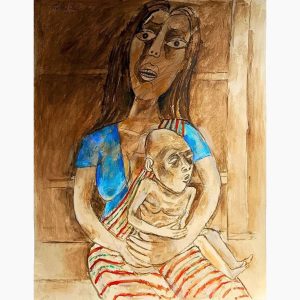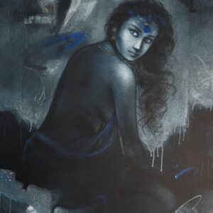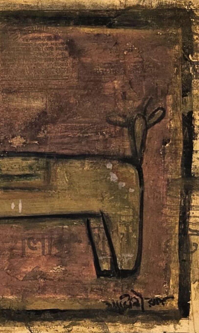 This painting is a beautiful work by Jamini Roy, one of the most celebrated modernist painters of India. Executed in tempera on newspaper, it showcases his distinctive style that drew inspiration from traditional Bengali folk art, especially the Kalighat Pat tradition. The artwork depicts a stylized animal figure—possibly a deer or bull—with exaggerated features such as a large, almond-shaped eye and simplified geometric forms. The earthy tones of ochre, brown, and muted green combined with bold black outlines create a rustic, folk-inspired charm. Roy’s use of minimalistic yet powerful detailing emphasizes both symbolic expression and aesthetic purity, reflecting his desire to return to indigenous roots while breaking away from Western academic art.