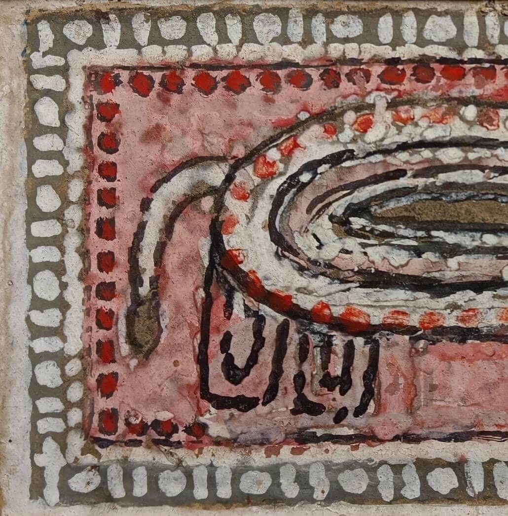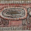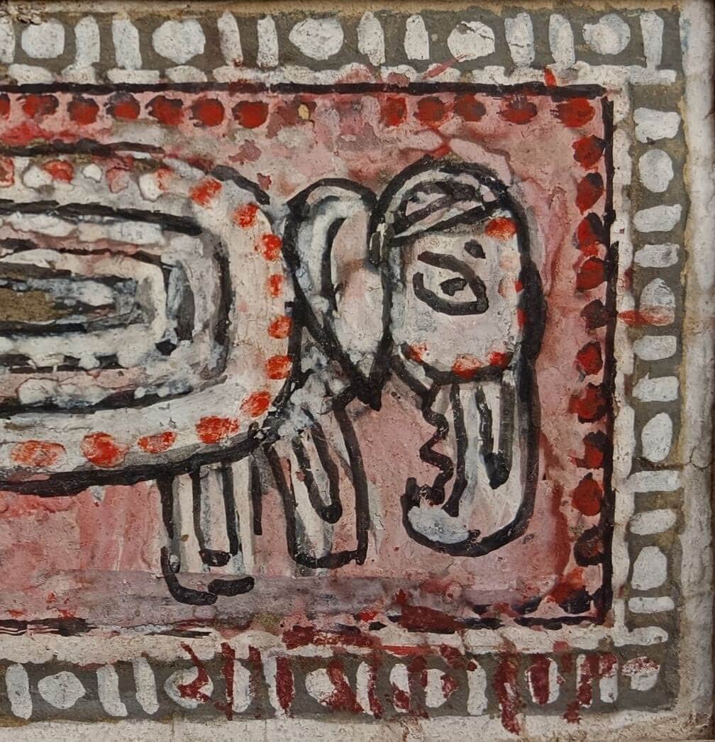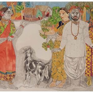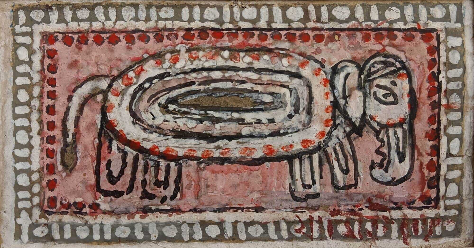 This artwork is a fine example of Jamini Roy’s folk-inspired style, painted in tempera on paper. The composition presents a stylized animal figure, likely an elephant, rendered in a highly simplified and almost symbolic form. The oval, patterned body with concentric layers of white, red, and earthy tones gives the painting a rhythmic quality, while the thick black outlines recall the linear strength of traditional Bengali patachitra. The border of dots and patterns further enhances the folk aesthetic, framing the subject in a decorative yet primitive manner. Roy’s intention was not naturalistic representation, but rather to capture the spirit and essence of indigenous art, making this work an elegant blend of abstraction and tradition.