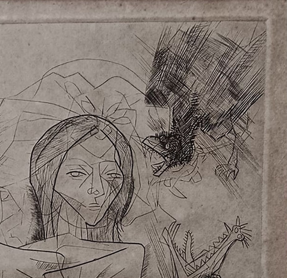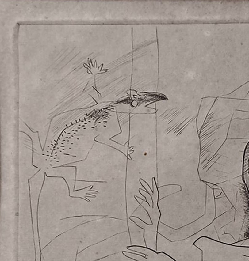 Somnath Hore, a towering figure in modern Indian art, was deeply influenced by human suffering and social injustice. This work, rendered in fine, expressive lines on a subdued, almost raw surface, is a striking example of his minimalist and emotionally potent visual language. At the center is a woman, drawn with fragmented, overlapping contours, caught in a surreal and disturbing scene where lizard-like creatures and strange figures surround her. The disjointed forms and etched textures evoke psychological distress, alienation, and violence — core themes in Hore’s oeuvre.