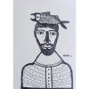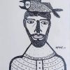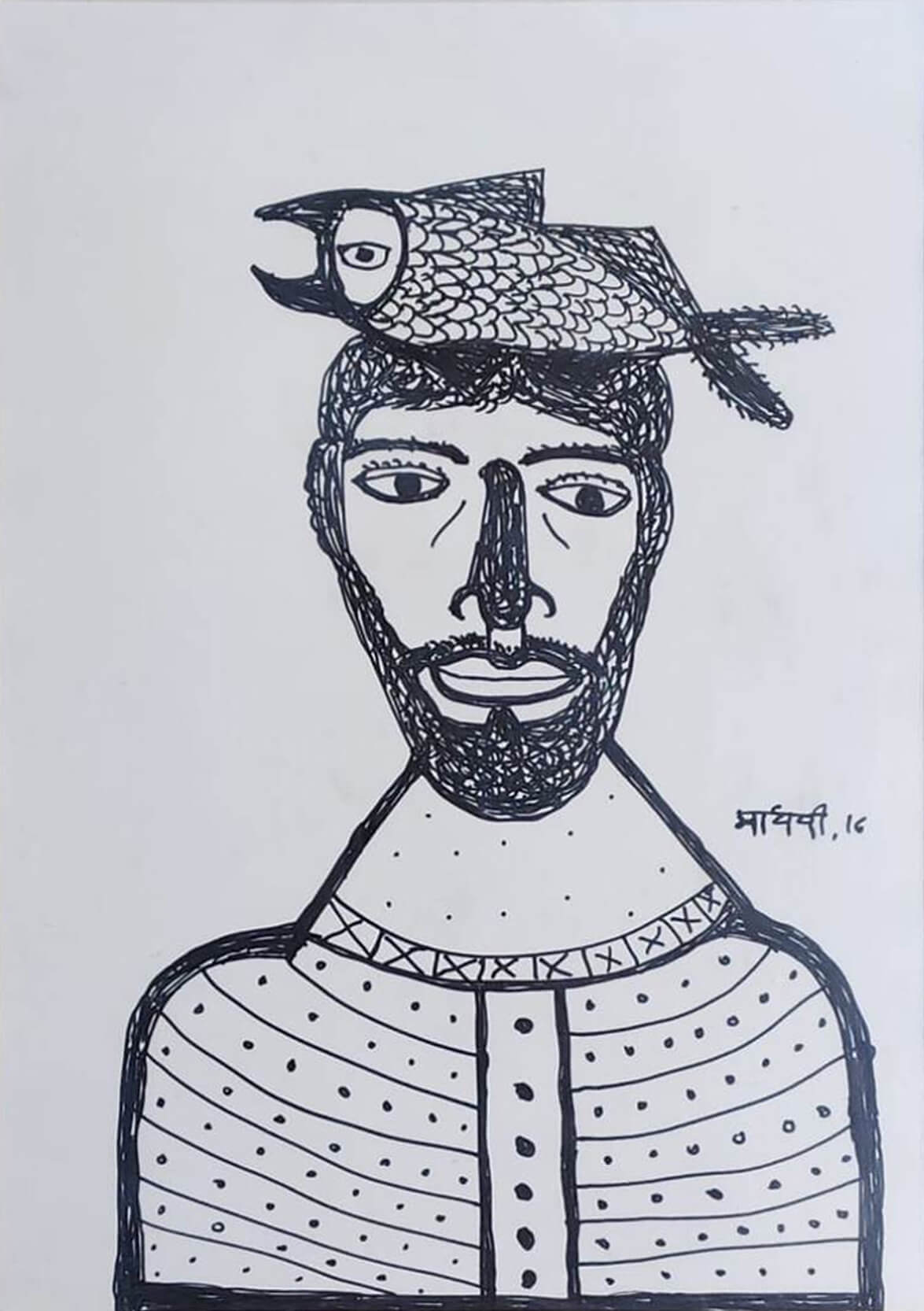 This artwork is a striking ink on paper piece by Madhvi Parekh, created in 2016. Rendered in her distinctive folk-inspired style, the composition presents a bold linear portrait of a man with a serene yet enigmatic expression. What immediately stands out is the imaginative element of a fish placed on the figure’s head, almost as if it were a crown or a symbol of thought. The simplified forms, patterned details on the attire, and rhythmic use of lines create a visual language that resonates with traditional Indian folk art yet carries a modern sensibility. The black-and-white contrast heightens the symbolic intensity of the image, leaving the viewer to interpret the surreal combination of man and fish as a metaphor for coexistence with nature, memory, or the subconscious. This work beautifully reflects Parekh’s ability to blend narrative, symbolism, and simplicity into a deeply compelling visual statement.