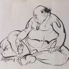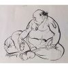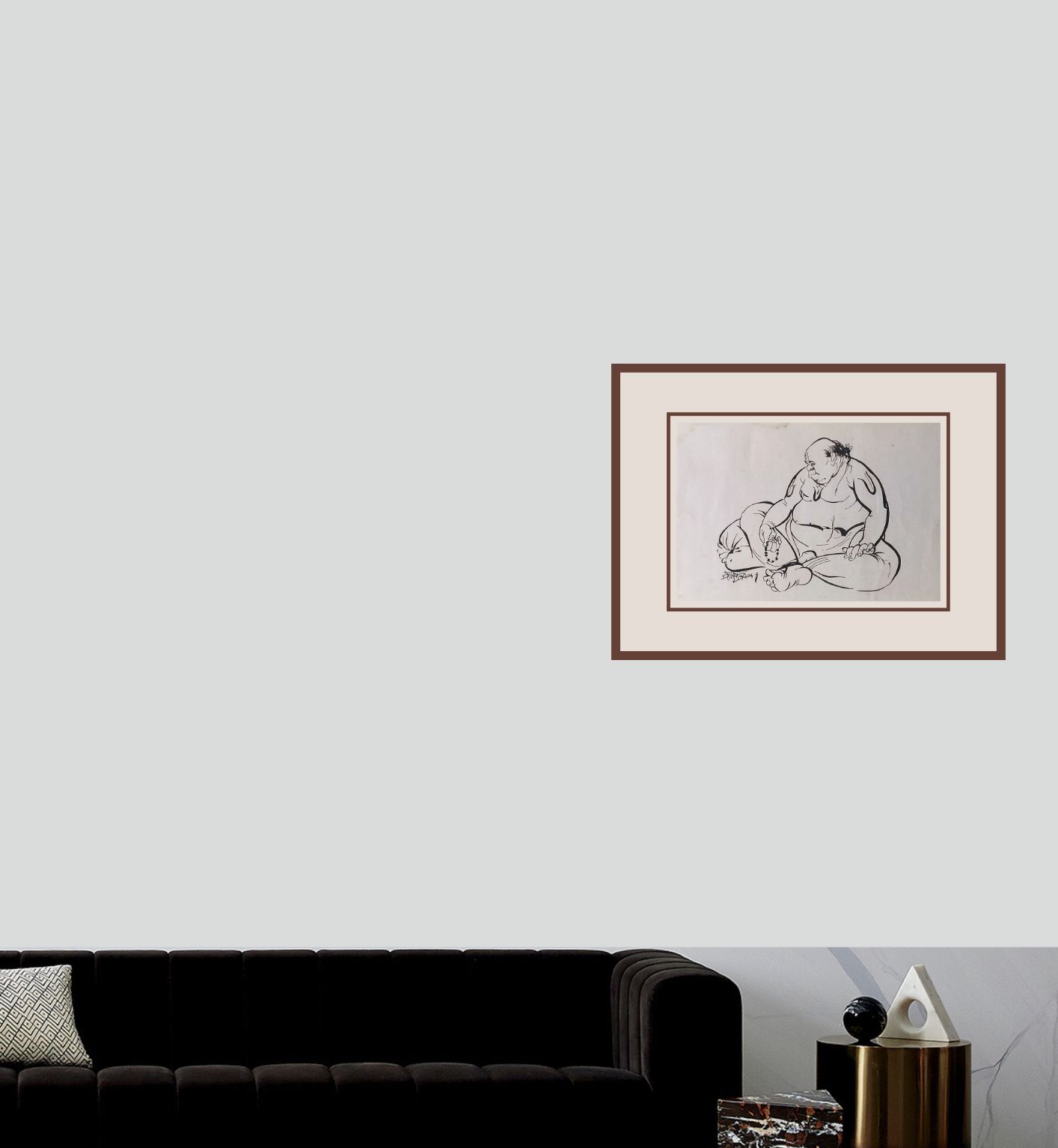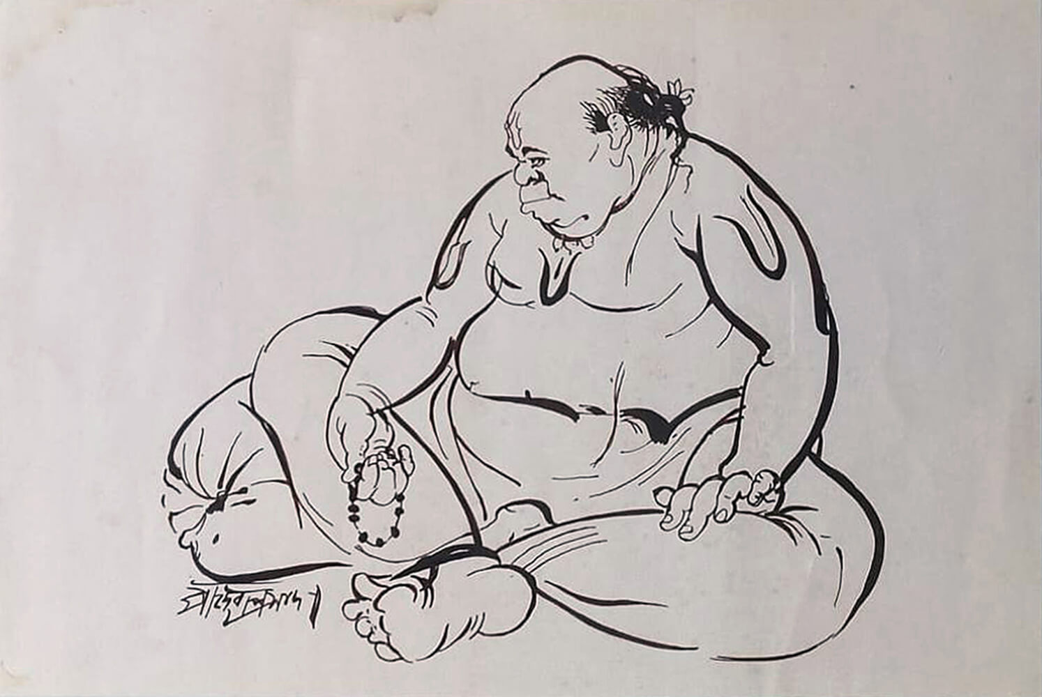 This ink on paper work by Devi Prasad Roy Chowdhury is a striking example of his mastery in line drawing and character study. The artwork depicts a corpulent man seated cross-legged, his body rendered with bold, flowing strokes that capture both physical weight and psychological presence. The figure holds prayer beads in one hand, suggesting a moment of contemplation or ritual, while his downward gaze and heavy posture evoke a sense of inwardness tinged with weariness. Roy Chowdhury’s use of simple, confident lines brings vitality and expressiveness to the form without the need for elaborate detailing. The exaggerated proportions and curves of the body reveal his interest in human character and social observation, where physicality becomes a mirror of personality and lived experience. This drawing reflects the artist’s ability to blend naturalism with caricature-like exaggeration, making it both humorous and deeply human. Through minimal means, he achieves a richness of expression that speaks to his command over draftsmanship and his keen eye for the subtleties of human nature.