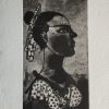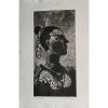 This artwork by K. Laxma Goud, is an intaglio print that reflects his deep engagement with rural life, tradition, and human sensibilities. The composition presents the profile of a woman, her elongated neck and stylized features rendered with striking precision and bold contrasts of light and shadow. The detailing in her attire—marked by floral patterns and textured fabric—along with the decorative headpiece, highlights Goud’s sensitivity to ornamentation and cultural identity. The strong profile, with its sharp gaze and dignified bearing, conveys both strength and quiet grace, embodying the artist’s recurring exploration of feminine presence in his works. Executed with a masterful balance of line and texture, the intaglio technique enhances the depth and richness of the image, giving it a tactile quality that resonates with his earthy, narrative-driven style. This print not only celebrates beauty and individuality but also reflects Goud’s ability to fuse tradition with modernist aesthetics, making his art both intimate and timeless.