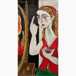 This painting is a fine example of Jamini Roy’s distinctive style, which drew inspiration from traditional Indian folk art, particularly the Kalighat pat tradition. Executed in tempera on board, the artwork depicts a seated figure with an olive-green complexion, stylized features, and bold contour lines. The use of earthy tones—ochre, orange, and muted greens—along with flat planes of color and simplified forms, reflects Roy’s departure from academic realism and his embrace of indigenous aesthetics. The figure, adorned with minimal jewelry and draped clothing, exudes a sense of calm presence and spiritual grace. The overall composition highlights Roy’s mastery in blending modernist sensibilities with folk idioms, making his works timeless and deeply rooted in Indian cultural identity.