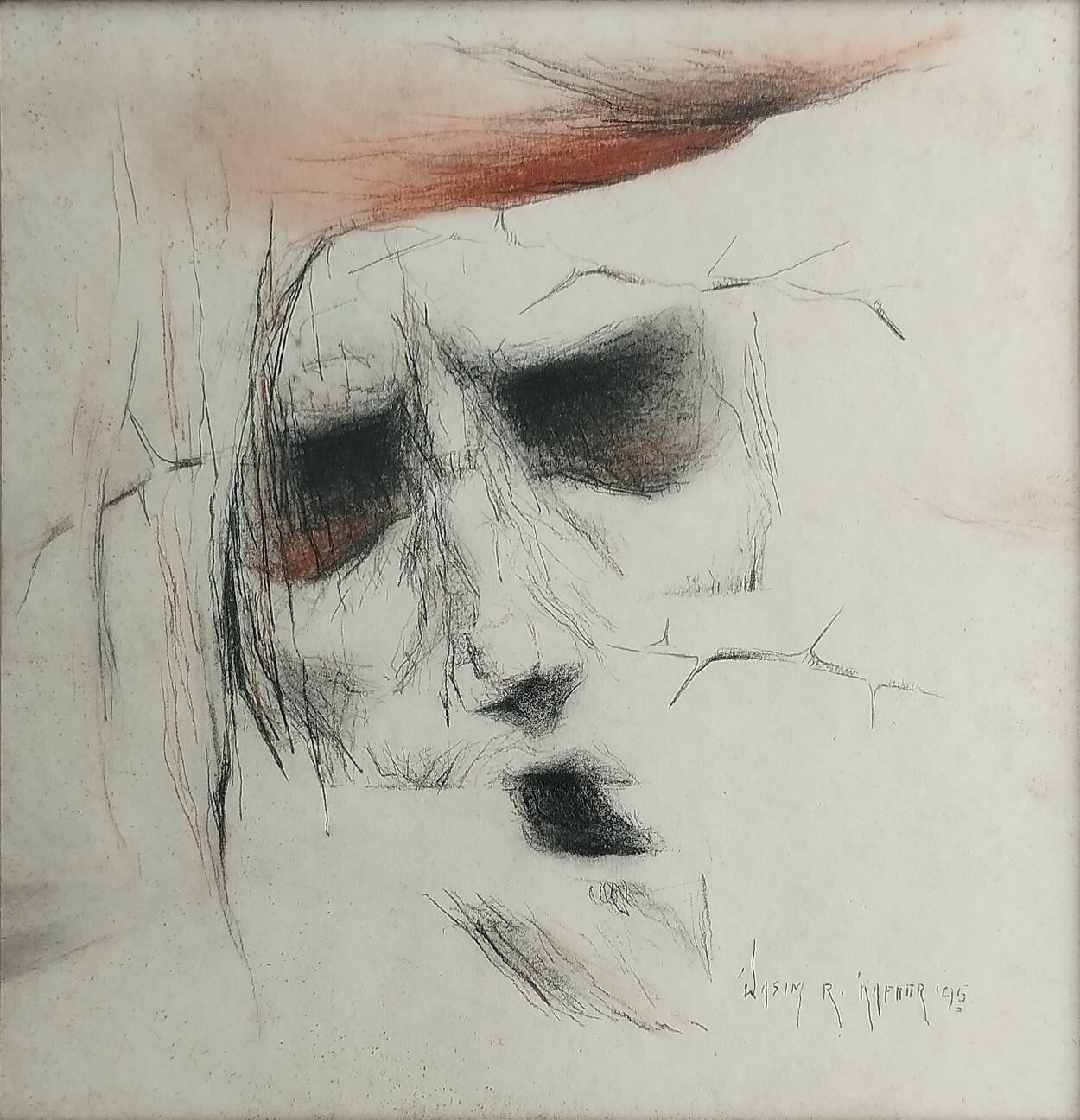 This haunting artwork by Wasim Kapoor, created in 1995, embodies his signature exploration of human suffering and despair. The ghostly, fragmented face emerges from the textured background, with deep-set, shadowed eyes and cracked features evoking pain and vulnerability.