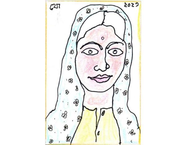 This artwork depicts a serene portrait of a woman rendered in a stylized, linear form reminiscent of folk traditions. Her expression is calm and composed, with large, outlined eyes and soft, curved lips that evoke a quiet dignity. Draped in a light blue veil adorned with small floral motifs, the woman’s presence suggests simplicity and grace. The artist employs delicate hues of pink, yellow, and blue to create a gentle warmth, while the bold black contours give structure and rhythm to the composition. The work captures the essence of Indian femininity — modest yet strong, rooted in cultural identity yet timeless in emotion. The date “2023” inscribed on the top corner hints at its contemporary creation, yet its visual language connects deeply with indigenous and modern Indian art sensibilities.