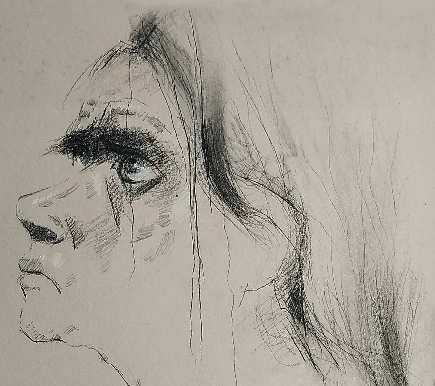 This evocative artwork by Wasim Kapoor, created in 2003, captures deep emotion through expressive strokes and raw detailing. The intense gaze, furrowed brows, and tear-streaked face convey anguish, resilience, or silent suffering.