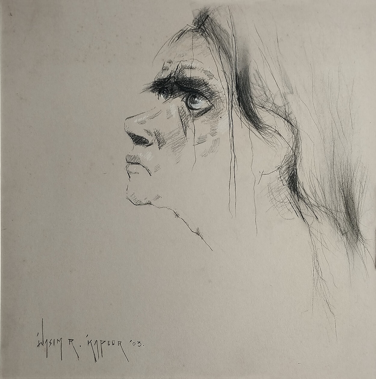 This evocative artwork by Wasim Kapoor, created in 2003, captures deep emotion through expressive strokes and raw detailing. The intense gaze, furrowed brows, and tear-streaked face convey anguish, resilience, or silent suffering. The loose, fading lines of the hair and background enhance the ethereal and haunting quality of the piece. Kapoor’s mastery in blending realism with abstraction allows the viewer to connect with the unspoken narrative, making this work a poignant exploration of human emotions and inner turmoil.