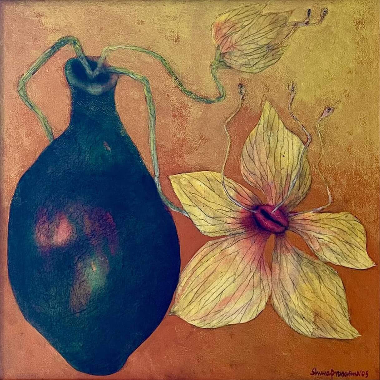 This beautiful painting by Shuvaprasanna Bhattacharya exudes a sense of delicate harmony between life and stillness. Set against a warm ochre background, the composition juxtaposes a deep, earthy vase with a vibrant, blooming flower, their organic forms connected by curling green tendrils. The flower, rendered in soft yellows and pinks, radiates vitality and grace, while the dark vessel beside it suggests stability and containment. The textural surface and subtle interplay of light and shadow enhance the tactile quality of the work, giving it both depth and warmth. Through this poetic dialogue between the vessel and the flower, the artist explores themes of creation, continuity, and the fragile beauty of existence. The painting’s simplicity is enriched by its emotional resonance, capturing a timeless moment where nature and form meet in perfect visual rhythm.