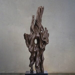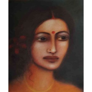 This vibrant painting by Jamini Roy reflects his mastery in blending folk art traditions with modernist sensibilities. Executed in tempera on board, the work portrays a devotional figure seated in a meditative posture, hands raised in a gesture of reverence. The figure, rendered in striking yellows and reds with bold black outlines, radiates an aura of warmth and spiritual intensity. The textured application of color, reminiscent of mosaic-like brushstrokes, enhances the rhythmic surface of the painting. The symmetrical composition, elongated almond-shaped eyes, and stylized forms draw directly from Bengal’s patachitra tradition, while the decorative border frames the figure with a ritualistic aura. This piece beautifully captures Jamini Roy’s dedication to elevating indigenous folk idioms into the realm of fine art.