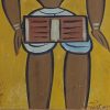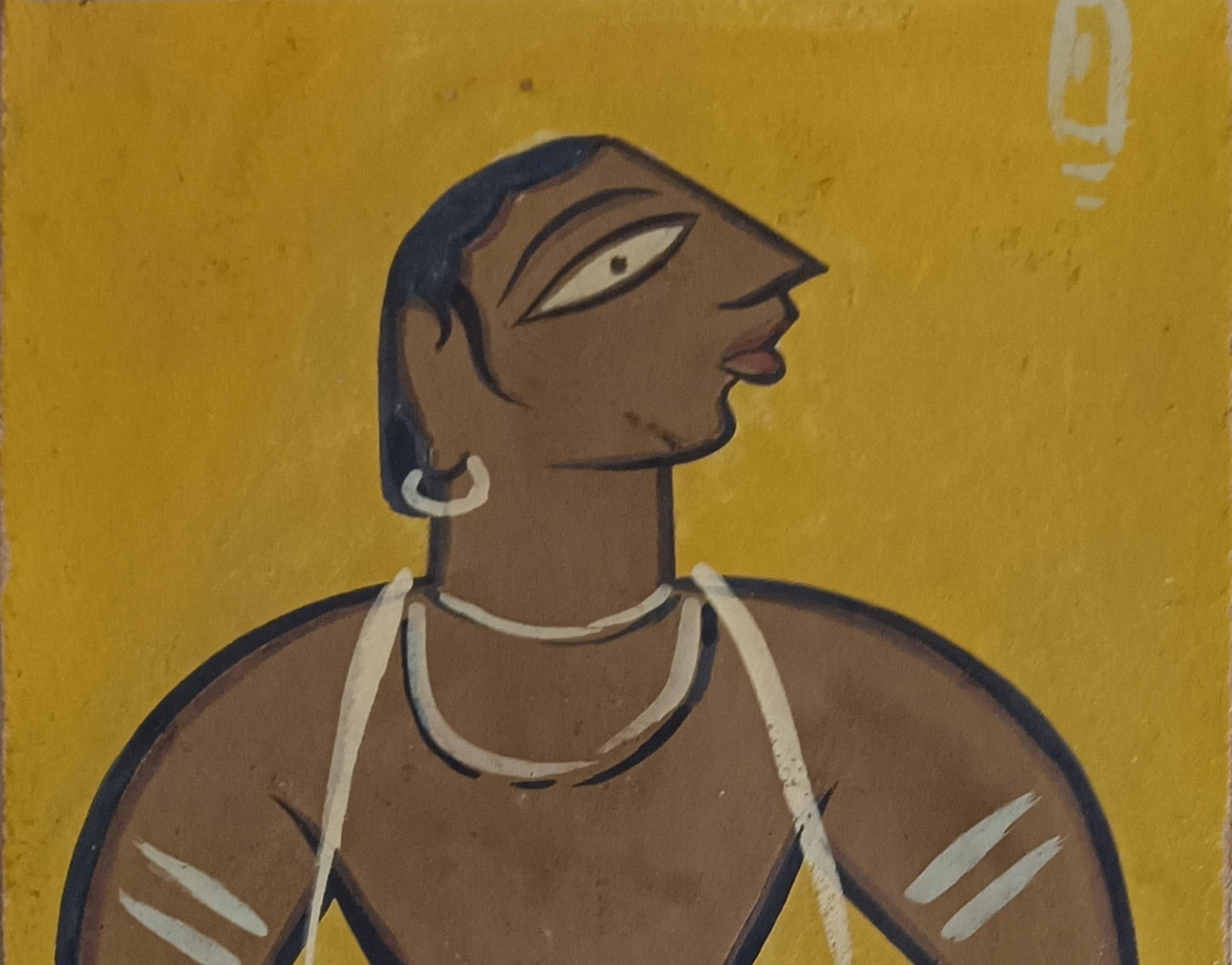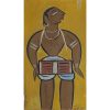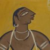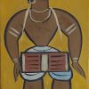 This painting by Jamini Roy is a striking representation of a folk musician, specifically a dhol player, rendered in the artist’s signature Kalighat-inspired folk style. The figure, centrally placed against a solid ochre-yellow background, exudes both strength and simplicity. The bold lines, earthy palette, and minimal use of detail reflect Roy’s dedication to Indian village life and indigenous artistic traditions. The musician, wearing traditional attire, is depicted in a stylized pose with large, almond-shaped eyes and strong contours, holding a dhol (a traditional Indian drum) tied around his waist. His posture and expression convey a sense of rhythm and cultural pride. This work highlights Roy’s celebration of rural artisans and performers, offering a powerful visual narrative grounded in everyday Indian life.