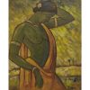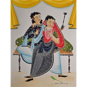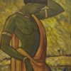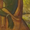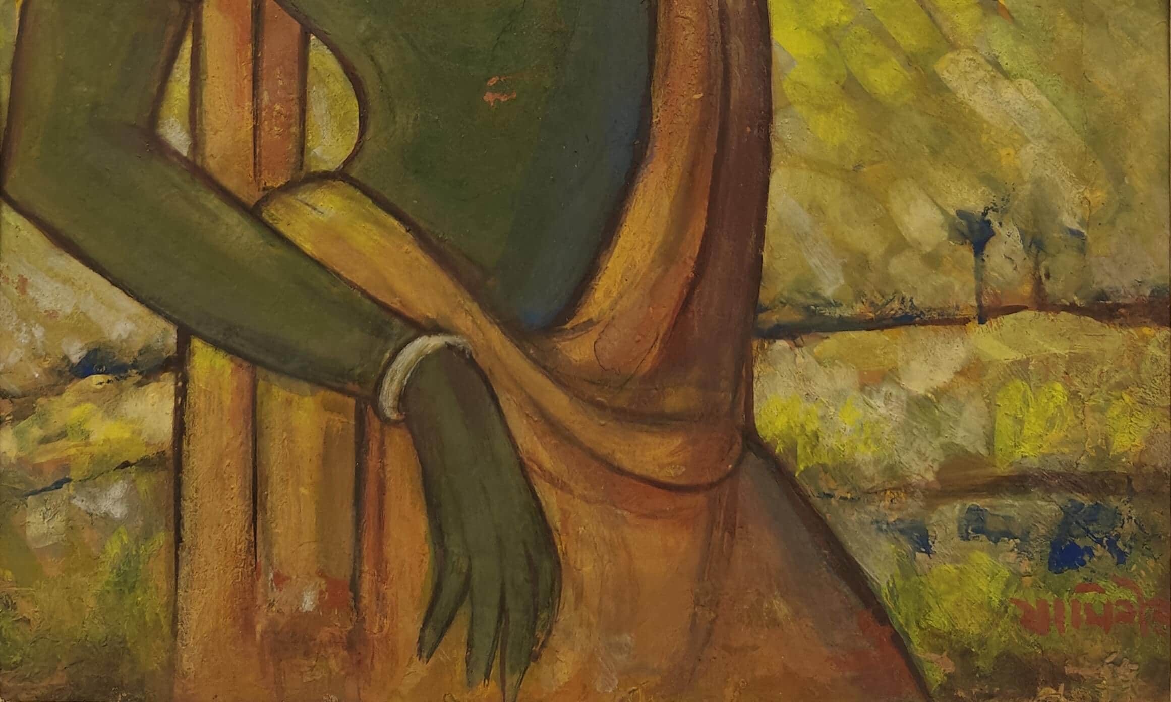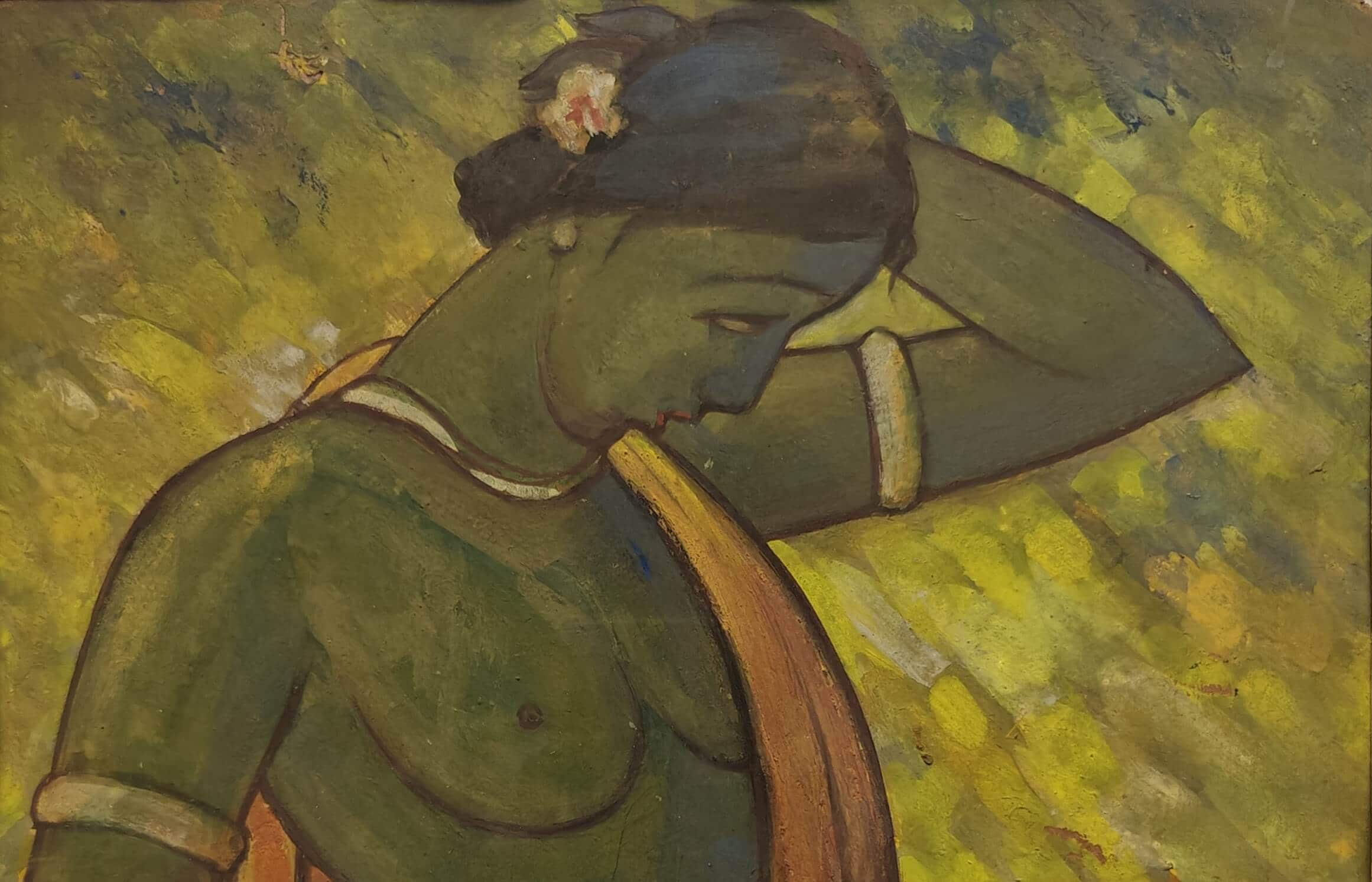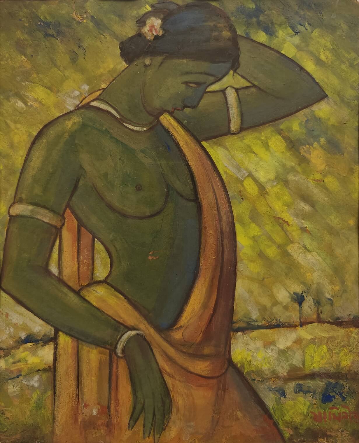 This painting by Jamini Roy depicts a Santhal woman, reflecting his deep admiration for the tribal communities of Bengal and their simple, harmonious way of life. Executed in tempera on board, the artwork captures the woman in a graceful, introspective pose, with her arm lifted to adjust her hair and her head gently tilted downward. The green-toned figure, adorned with a flower in her hair and clothed in a flowing ochre drape, stands against a textured background of earthy yellows and greens, evoking the vibrancy of rural landscapes. Roy’s bold outlines, simplified forms, and luminous palette combine to highlight both strength and elegance, embodying the dignity and vitality of Santhal women. This painting beautifully reflects his departure from Western academic realism toward a uniquely Indian modernist idiom rooted in indigenous traditions.