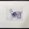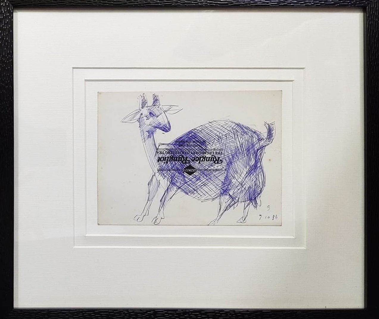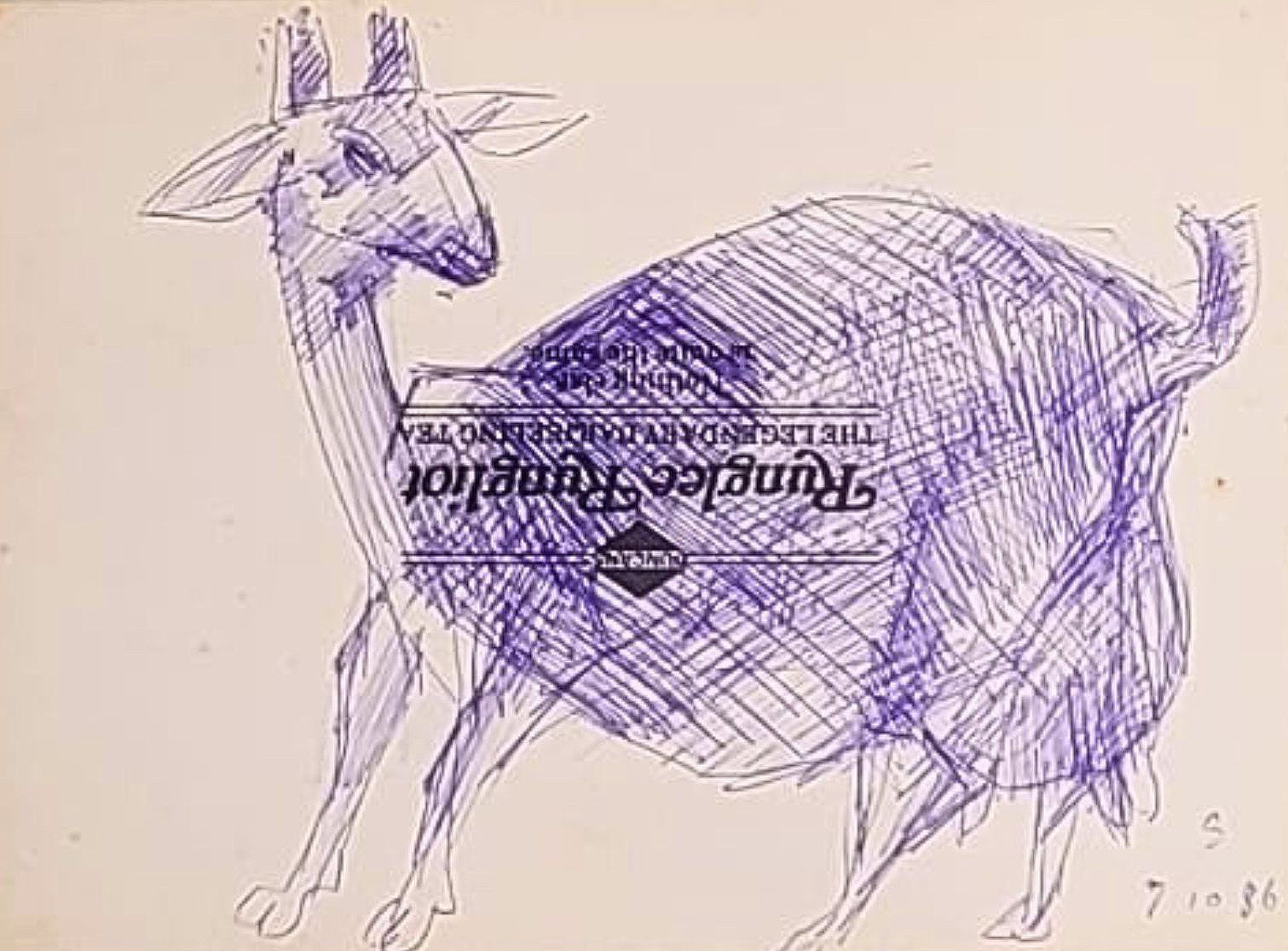 This pen and ink drawing by Somnath Hore, dated 07-10-1986, presents a lively sketch of a goat rendered with swift, confident lines and cross-hatching techniques. Using a simple blue ballpoint pen, Hore captures the form and character of the animal with minimal detail but remarkable immediacy. The goat’s large, rounded body contrasts with its delicate legs and expressive head, highlighting Hore’s skill in balancing form and rhythm. Intriguingly, the sketch appears to be done on the reverse side of a printed piece of paper—possibly a reused publication or pamphlet—hinting at the artist’s spontaneous and resourceful process. This unassuming drawing speaks to Hore’s deep engagement with everyday life and his ability to find expressive potential in the most modest materials.