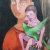 The mother’s gaze is steady and contemplative, her presence grounding the composition. Cradled in her arms, the child appears both playful and curious, reaching toward a vivid green parrot — a striking symbol of innocence, communication, and vitality. Below, a gentle animal looks upward, adding another layer of tenderness and protection to the narrative.