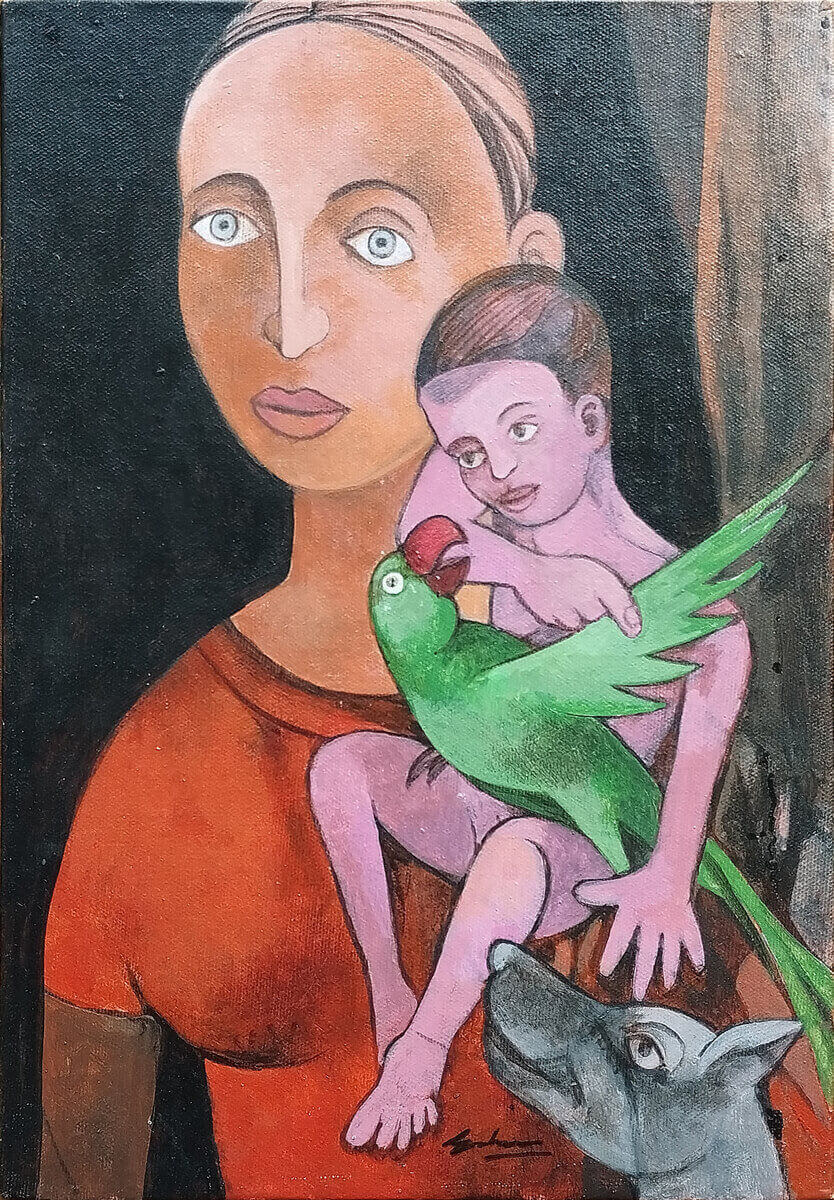 There is something quietly powerful about this composition — a stillness that holds emotion beneath its surface. Gurucharan Singh presents a mother and child in a stylized, almost icon-like format, where large expressive eyes and simplified forms heighten the emotional intensity of the scene.