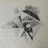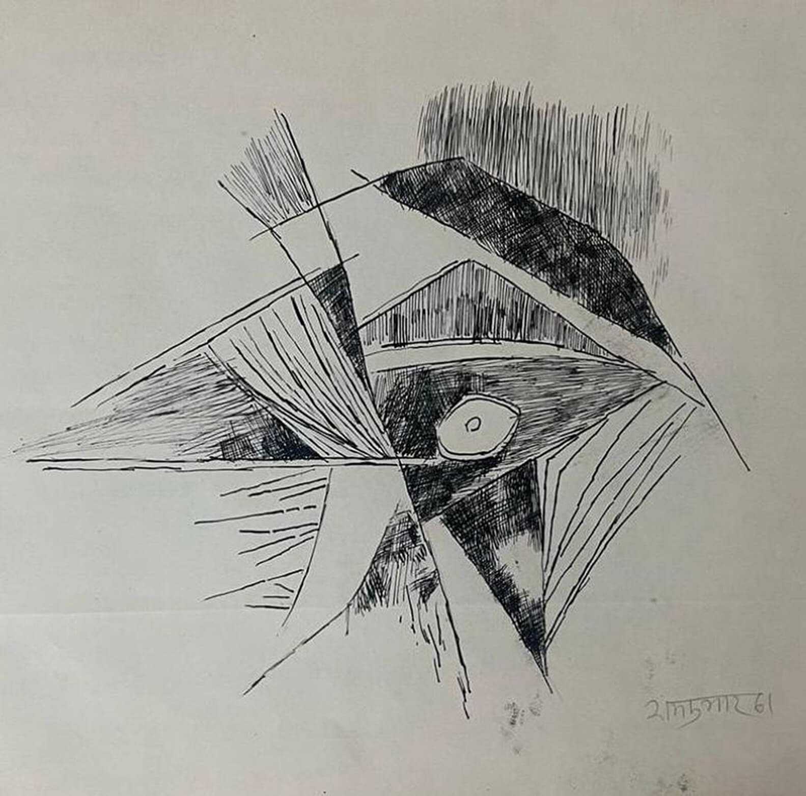 This artwork, created by Ram Kumar in 1961, is an untitled pen and ink drawing on paper. Known as one of India’s foremost modernists, Ram Kumar’s practice often shifted between figuration and abstraction, and this work exemplifies his early explorations of form and expression. The composition is built through sharp, intersecting lines, angular planes, and bold cross-hatching, creating a fragmented yet dynamic structure. At its center, the circular form resembling an eye or nucleus anchors the work, while the surrounding geometric patterns radiate outward, suggesting both movement and tension. The use of pen and ink highlights Ram Kumar’s mastery over line, where density and sparseness are balanced to evoke depth, texture, and rhythm. The drawing captures a moment of transition in the artist’s career, when he was gradually moving away from figurative depictions of urban alienation toward a more abstract visual language. With its stark monochromatic palette and architectural precision, the work conveys both emotional intensity and a search for structure within chaos, marking it as an important example of Ram Kumar’s modernist vision.
