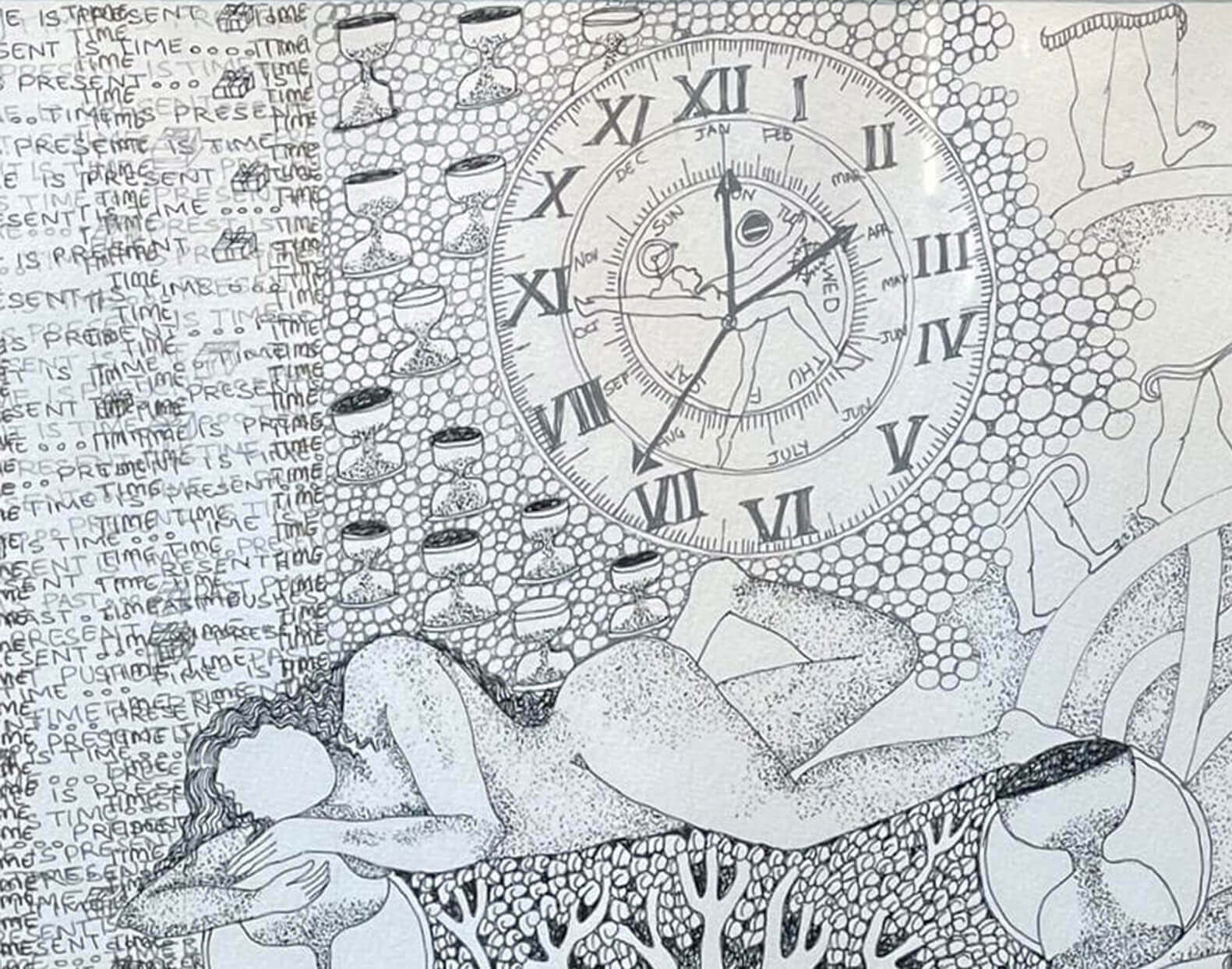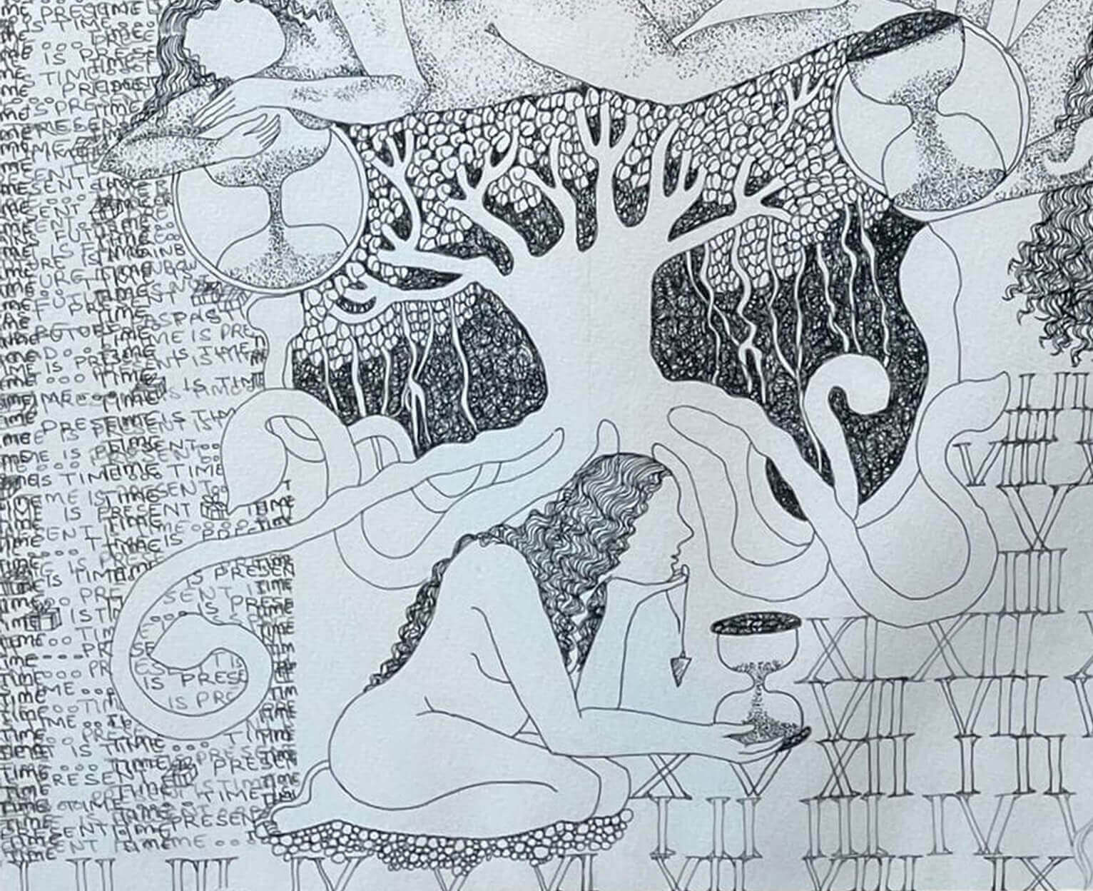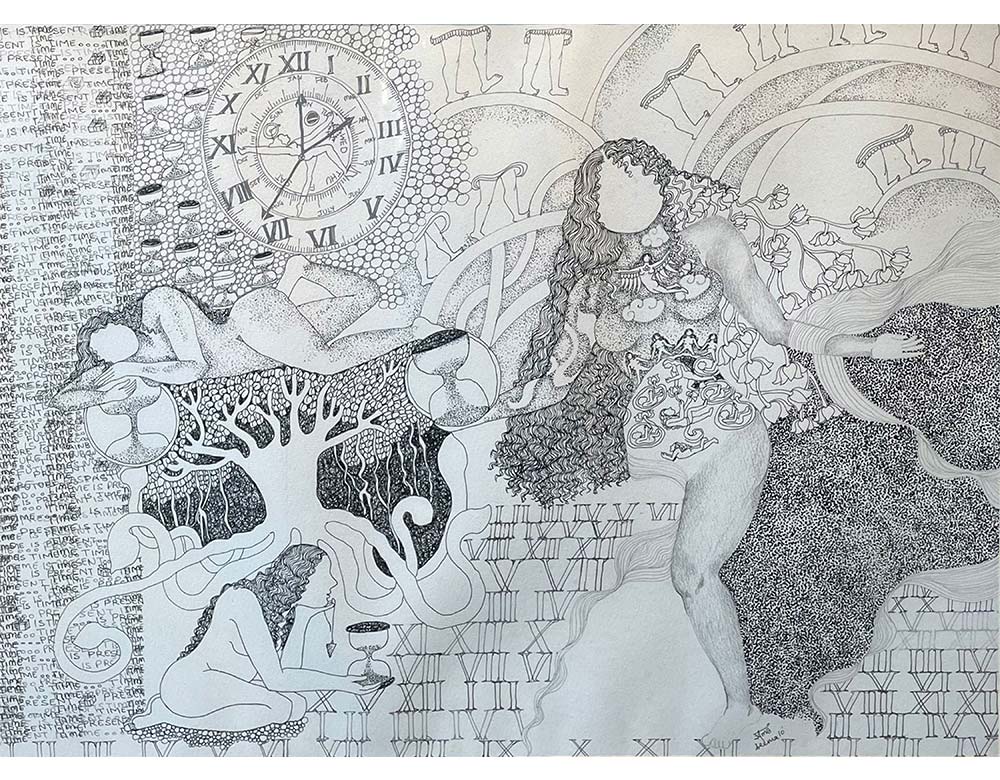 This artwork is a symbolic drawing that explores time, existence, and life’s cycles. Filled with clocks, Roman numerals, and hourglasses, it reflects the constant presence of time. Faceless figures and flowing organic forms suggest universality and transformation, while the repeated phrase “Time is Present” emphasizes the importance of the moment. Blending natural imagery with mythic symbolism, the piece becomes a meditation on transience and the timeless flow of life.