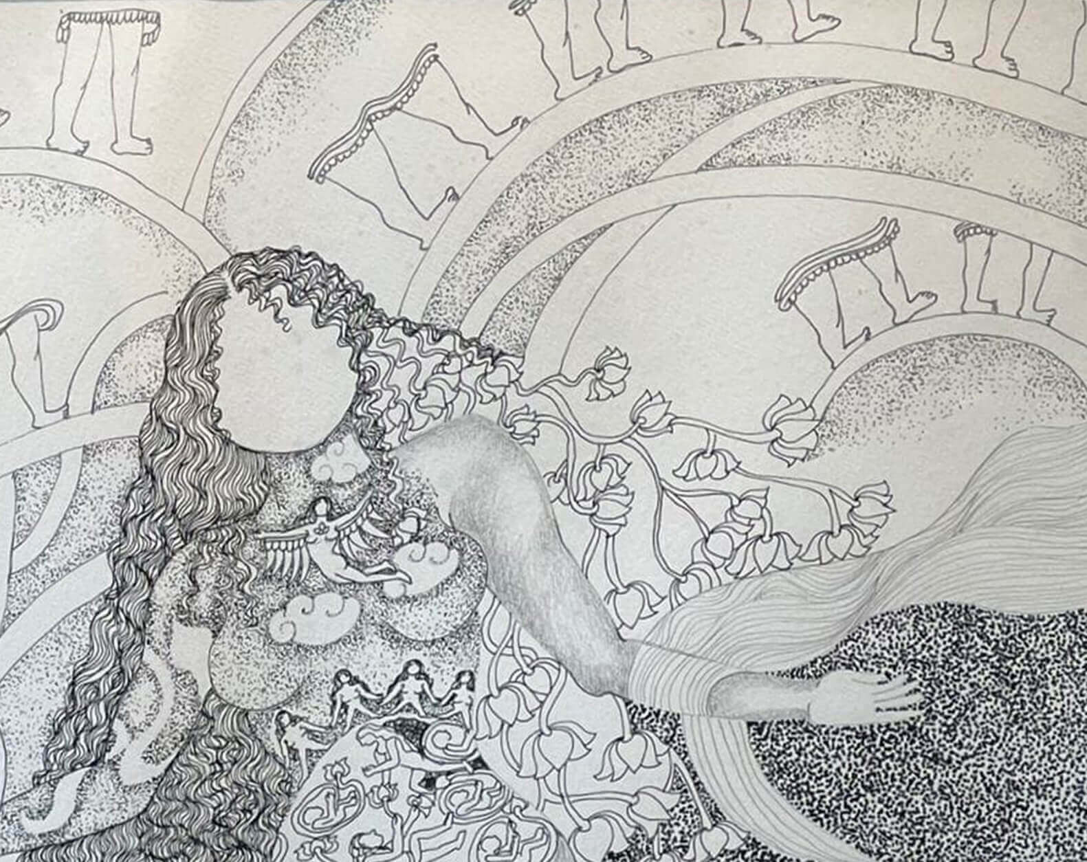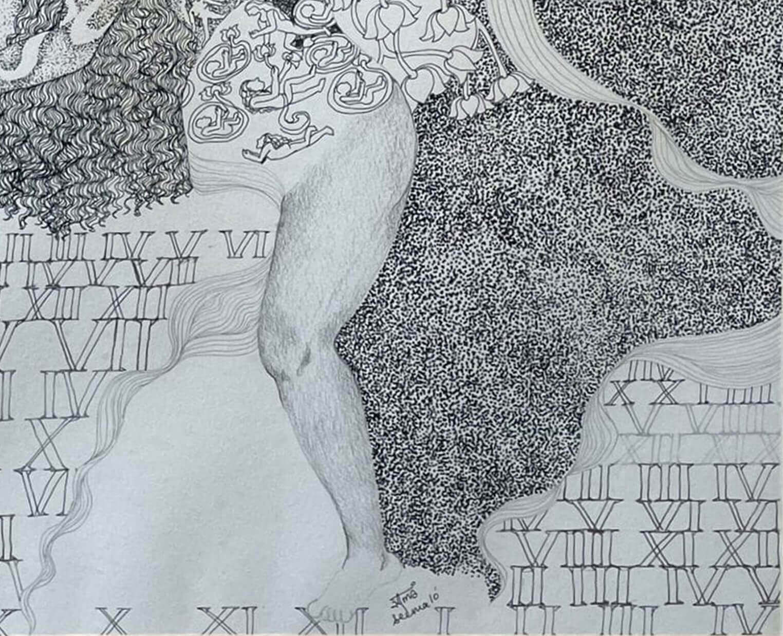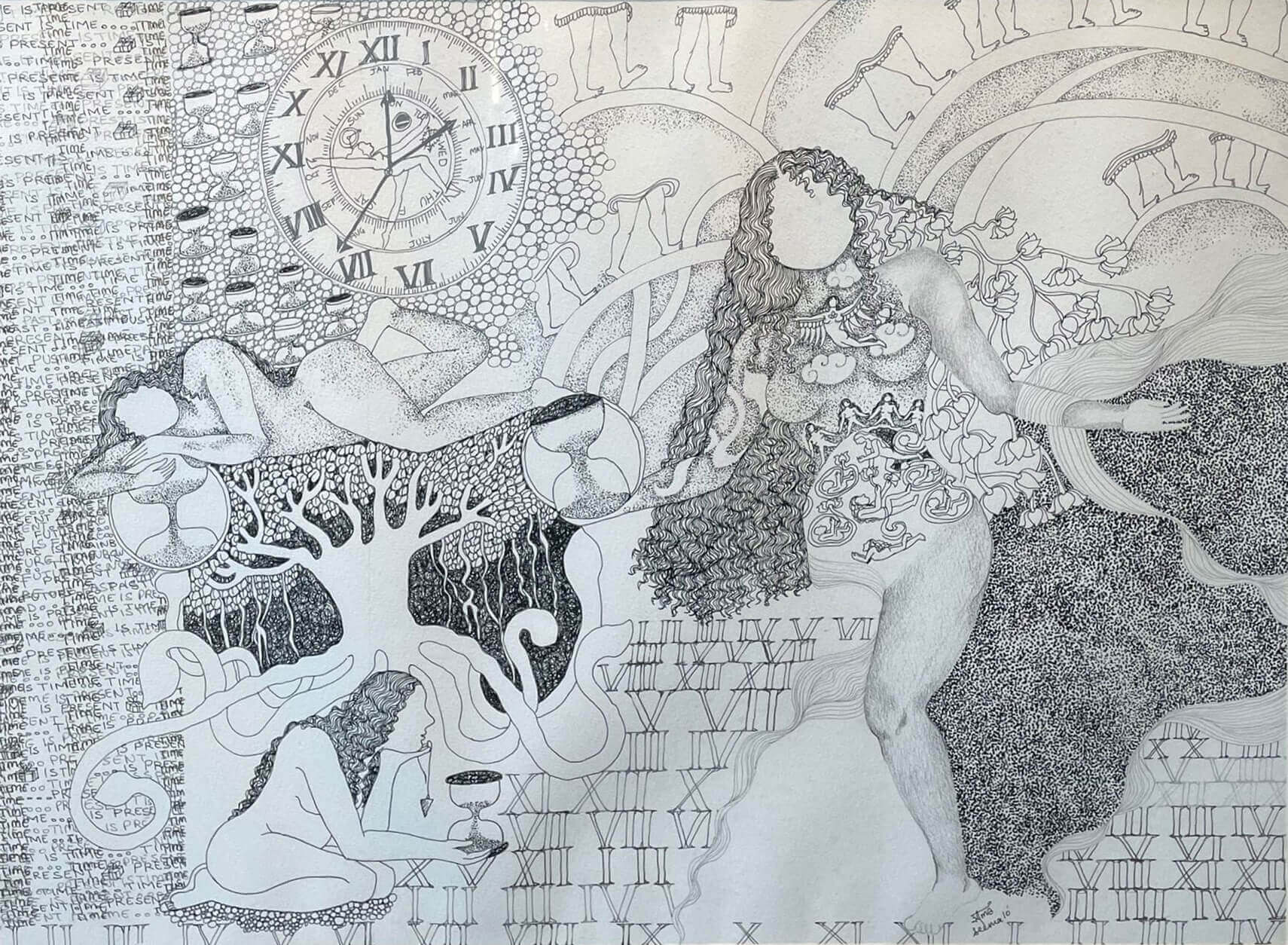 This artwork is a symbolic drawing that explores time, existence, and life’s cycles. Filled with clocks, Roman numerals, and hourglasses, it reflects the constant presence of time. Faceless figures and flowing organic forms suggest universality and transformation, while the repeated phrase “Time is Present” emphasizes the importance of the moment. Blending natural imagery with mythic symbolism, the piece becomes a meditation on transience and the timeless flow of life.