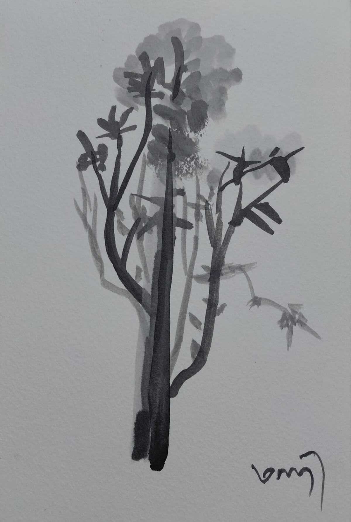 This delicate monochrome composition captures the quiet dignity of a tree standing in stillness. With fluid, assured brushstrokes, the artist builds the form through layers of tonal greys and deep blacks, allowing the trunk to anchor the composition while translucent washes suggest foliage gently dissolving into space.
