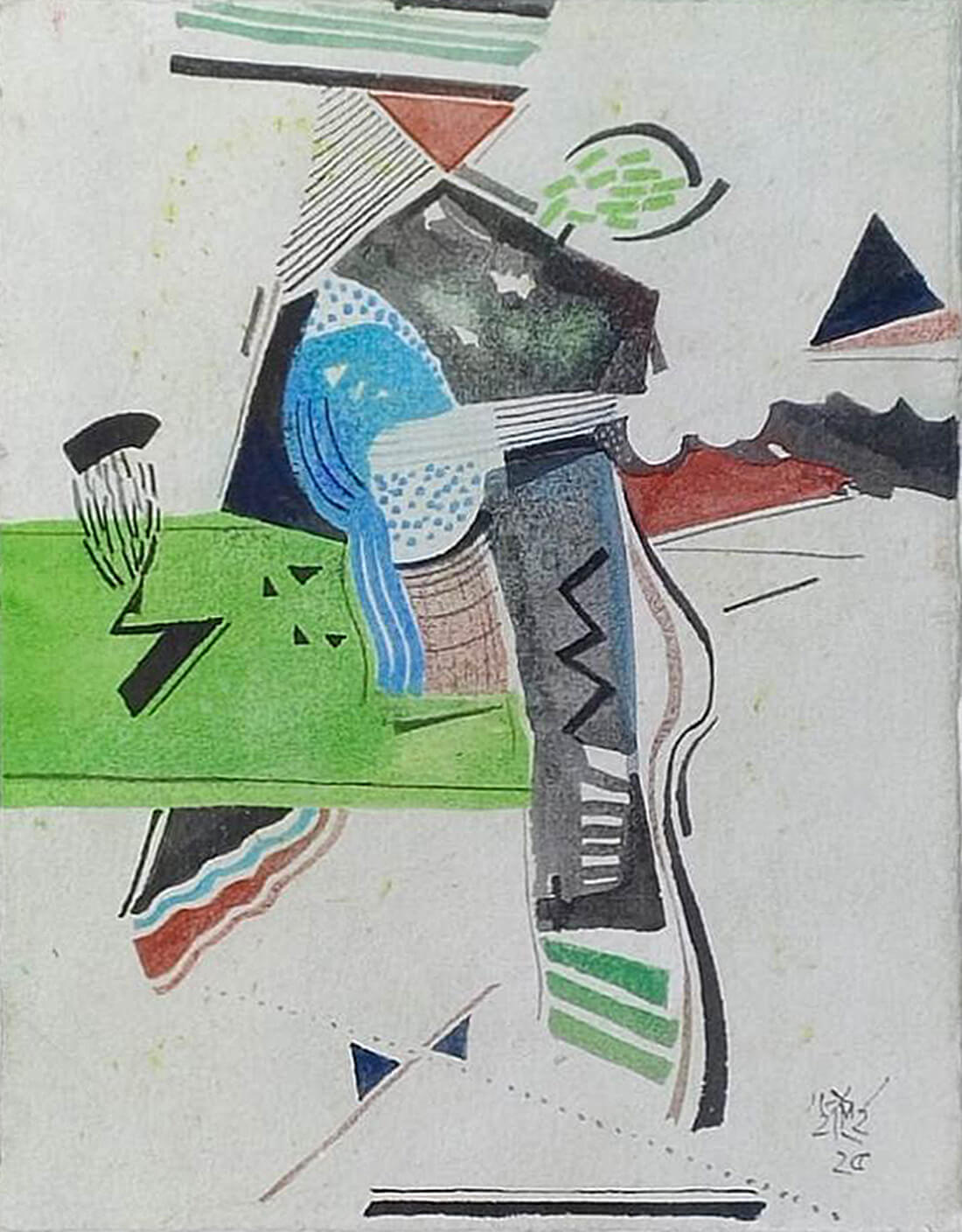 This untitled watercolour on paper by Ganesh Haloi, created in 2025 is a fine example of his lyrical abstraction that bridges memory, landscape, and inner reflection. The composition is built with geometric shapes, rhythmic lines, and patches of vibrant yet restrained colours—greens, blues, blacks, and reds—arranged in a way that feels both spontaneous and deeply structured. The use of angular forms and delicate textures suggests a dialogue between nature and architecture, while the soft transitions of colour highlight Haloi’s mastery over the watercolour medium. The green plane, intersected with black markings, contrasts with fluid blue and earthy tones, creating a balance of movement and stillness. As in much of his work, Haloi transforms personal memory and displacement into poetic abstraction, where fragments of landscapes, foliage, and architectural elements dissolve into a meditative rhythm of form and space. This painting captures his ability to evoke a sense of harmony and resilience through a visual language that is at once modern, contemplative, and deeply rooted in lived experience.