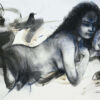 Rendered primarily in monochrome tones with subtle washes and expressive strokes, the piece carries a raw, sketch-like honesty. The sweeping charcoal lines give movement to her hair and form, while delicate touches of muted color add depth and atmosphere. In the background, symbolic elements — a small bird and abstract forms — quietly inhabit the space, enhancing the sense of solitude and contemplation without overwhelming the figure.